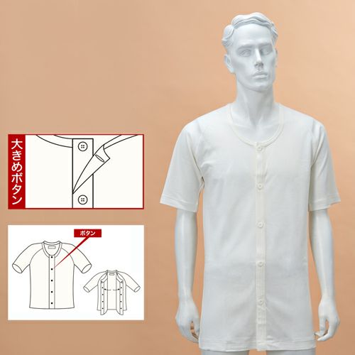 快適な日常生活をお過ごしいただけるためにお役立ていただける商品です前開きのボタン式肌着(15ミリの大き目ボタン) ※マジック式やホック式では抵抗のある方へ。※肌ざわりの良い高級エジプト綿を使用。無蛍光生地で肌に優しい生地を使用。 ※肌ざわりの良い高級エジプト綿を使用。無蛍光生地で肌に優しい生地を使用。 大き目のボタン式です。ワンタッチ式ではありません。 (ワンタッチテープ(マジック式)やホック式ではありません)高級エジプト綿を使用した 前開きタイプのボタン付きのシャツです。ボタンは大き目で扱いやすい15mmを採用しています。マジックやホックなどのワンタッチ肌着には抵抗のある方にも、ぜひお試しください。肌へのやさしさ 品質の基本は素材にこだわること。高級エジプト綿60単糸を使った 両面編立生地の使用によって、吸汗性、保湿性、肌ざわりのよさを 実現させました。着心地のよさ いつまでも快適な着心地が長続き。その理由は前立に採用した 共生地使いや、抜群の伸縮性を生む、独自の縫製技術にあります。●素材/綿100%●品質/60単糸両面編み(高級綿)●日本製 (兵庫県製)●肌にやさしい無蛍光生地を使用・蛍光剤は一切使用していません。生地・縫製糸・ケアラベルにいたるまで、無蛍光素材を使用しています縫製は一般的な縫い目が盛り上がる方法では無く、平になるように縫製しています。(フラットシーマーミシンを使用)当商品をはじめ、当社品番No.で始まるワンタッチ肌着(マジック式・ホック式・ボタン式)に採用しています。高級生地と合わせて、当商品の人気の秘訣です。