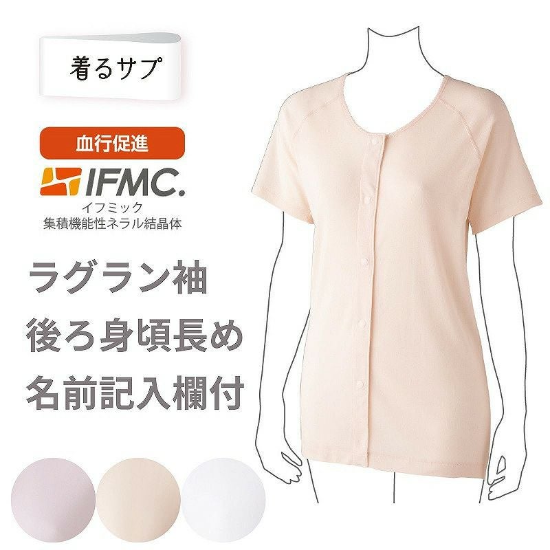 快適な日常生活をお過ごしいただけるためにお役立ていただける商品です着やすさとやさしい工夫のアイテムです温泉の研究から作った、血行促進効果ができる「着るサプ」。温泉の効果に着眼して開発した血行促進素材を繊維に加工させて作りました。着用し続けることで効果を実感してみてください。抗菌防臭、縫い目が外側で肌当たりが良い着脱カンタン!様々な工夫【プラスチックホック】脱ぎ着しやすい工夫を凝らした優しい設計です。ボタンが留めにくい方でも着替えに便利な前開きのホック留めです。後ろ身頃を長めにしているので、背中が曲がった方でも、背中が出にくい設計です。【動きやすいラグラン袖】肩まわりがゆったりしているので、肩や腕が動かしやすく、脱ぎ着がしやすい仕様です。名前記入欄付で間違い防止名前が書けるタグ付きなので、入院や施設入居時など、脱いだ後や洗濯後も他人のものと間違うことがありません。●品名/着るサプIFMC.3分袖ホックシャツ(2枚組)●色/ピーチ・ホワイト・ラベンダー●サイズ/S・M・L・LL●素材/綿100%●生産国/中国製●仕様/同色2枚組 タグ無し 洗濯機OK(ネット使用) 名前記入欄付 ホック 後ろ身頃長め 動きやすいラグラン袖 3分袖●説明/抗菌防臭、縫い目が外側で肌当たりが良いIFMC.(イフミック:集積機能性ミネラル結晶体)は(株)テイコク製薬社が温泉療法に着眼して製造したナノメーターレベルの非常に微小なミネラルの結晶体です。 数種類の鉱物を組み合わせて鉄分の多い温泉水に一定時間浸漬し、その溶出液を特殊処理して抽出した物質です。身体に近接させることで血管から一酸化窒素(NO)が拡散し、血管が拡張することによる血行促進効果が期待できます。
