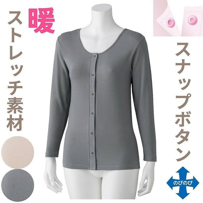 快適な日常生活をお過ごしいただけるためにお役立ていただける商品です着やすさとやさしい工夫のアイテムです【おしゃれインナー】ストレッチ素材の前開き肌着で着脱簡単素肌が喜ぶ心地よさをカジュアルテイストで!のびのび素材の前開き肌着です。着脱カンタン!様々な工夫【プラスチックホック】脱ぎ着しやすい工夫を凝らした優しい設計です。ボタンが留めにくい方でも着替えに便利な前開きのホック留めです。●品名/婦人ストレッチ長袖ホックインナー●色/ベージュ・グレー●サイズ/M・L・LL●素材/綿95%・ポリウレタン5%●生産国/中国製●仕様/洗濯機OK(ネット使用) のびのび(縦・横) ホック 長袖 綿ベア天竺●説明/【おしゃれインナー】ストレッチ素材の前開き肌着で着脱簡単素肌が喜ぶ心地よさをカジュアルテイストで!のびのび素材の前開き肌着です。