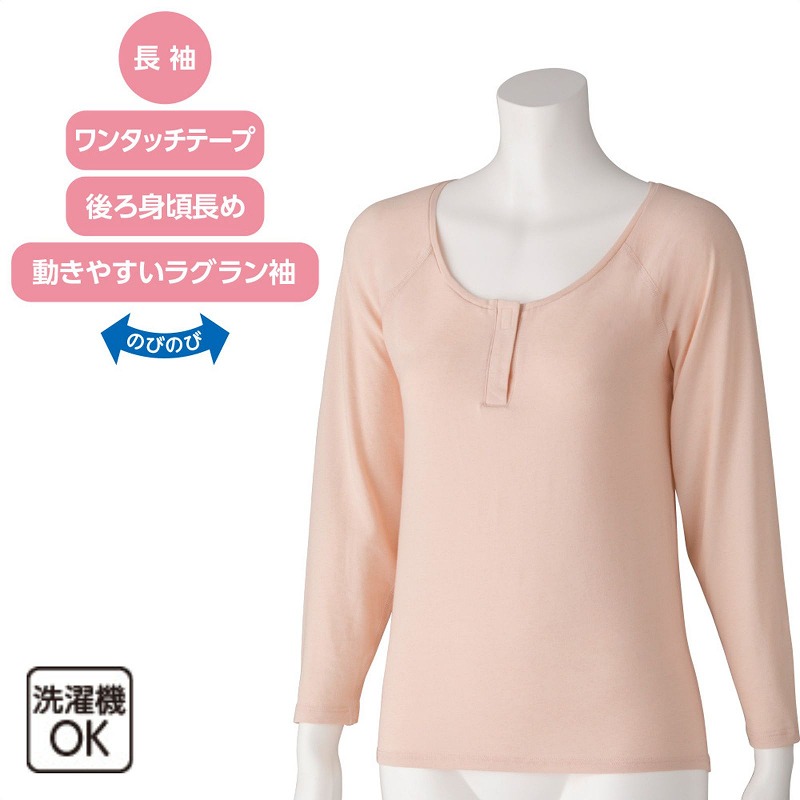 快適な日常生活をお過ごしいただけるためにお役立ていただける商品です着やすさとやさしい工夫のアイテムです半開きのかぶりタイプで着脱しやすい着脱らくらく長袖インナー。ストレッチ素材で体の動きに合わせて伸び、快適な着心地です♪ワンタッチテープ仕様で開け閉め簡単、ラグラン袖で腕まわりも動かしやすい設計。後ろ身頃長めで背中が出にくく安心、洗濯機OKで毎日清潔に使える便利なインナーです。着脱カンタン!様々な工夫【ワンタッチテープ】ボタンが留めにくい方は前合わせのワンタッチテープ仕様で、着替えがスムーズにワンタッチ肌着で前が開くので着脱が楽です開け閉めがさっとできるから着替えがラクラク!着やすく脱ぎやすい親切設計!前開きなので一人でも簡単につけることができますマジックテープ商品に関するご注意洗濯時にはゴミのなどの付着の原因になりますのでテープを張り合わせてください。後ろ身頃を長めにしているので、背中が曲がった方でも、背中が出にくい設計です。【動きやすいラグラン袖】肩まわりがゆったりしているので、肩や腕が動かしやすく、脱ぎ着がしやすい仕様です。●品名/着脱らくらく長袖インナー●色/ライトローズ・ラベンダー●サイズ/M・L・LL●素材/綿50%・ポリエステル40%・ポリウレタン10%●生産国/中国製●仕様/洗濯機OK(ネット使用) ワンタッチテープ 後ろ身頃長め 動きやすいラグラン袖 のびのび 長袖 ●説明/半開きのかぶりタイプで着脱しやすい着脱らくらく長袖インナー。ストレッチ素材で体の動きに合わせて伸び、快適な着心地です♪ワンタッチテープ仕様で開け閉め簡単、ラグラン袖で腕まわりも動かしやすい設計。後ろ身頃長めで背中が出にくく安心、洗濯機OKで毎日清潔に使える便利なインナーです。