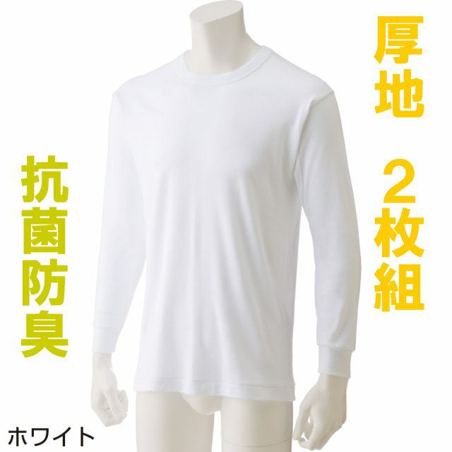 快適ベーシック肌着 秋冬に最適の丸首シャツ。袖口はめくり上がりにくいソフトゴム。秋冬用肌着 お得な2枚組です。 厚地でふんわりソフトな暖かさです。 袖口ソフトゴム使用 ●品名/厚地長袖丸首シャツ(2枚組)●色/ホワイト●サイズ/M・L・LL●材質/綿100%●追加説明/●生産国/ベトナム製●仕様/洗濯機OK 抗菌防臭加工 秋冬用●説明/まくり上がりにくい袖にソフトゴム使用秋冬に重宝するお買い得な厚手の肌着がさらにお手頃価格に。