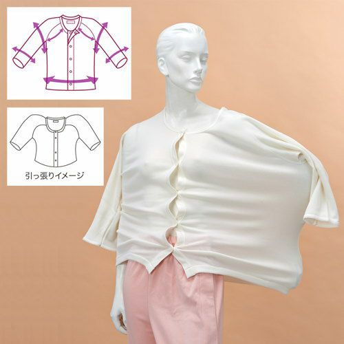 快適な日常生活をお過ごしいただけるためにお役立ていただける商品です厚手の、のびのび肌着。前開きワンタッチホック式 腕を伸ばしづらい方でも頭からすっぽりワンタッチホック+のびのび肌着+着心地最高+制菌加工。厚手となります。(生地は秋冬向けとなります)スパーストレッチで ぐーん とのびます!部屋干しにも対応する制菌力ここがポイント!前開きワンタッチホック式で着脱楽らく。腕を伸ばしづらい方でも頭からすっぽり、肩や腕部分も大きく伸びるので着せやすい。(脱がせやすい)。伸縮性のあるワンタッチ介護肌着。裏起毛仕上げで肌ざわりバツグン!!高い制菌力を有する安心素材を使用 (制菌加工 Vonnel Ag)使い方2通り1、ワンタッチホックで着脱らくらく2、のばして上からすっぽりウエスト横幅は円周で160cm以上に伸びます。 首から脇下まで(ラグラン袖部分)の円周で80cm以上に伸びます。●カラー/オフホワイト●素材/アクリル50%、ナイロン26%、ポリエステル15%、綿8% ポリウレタン1%●日本製●制菌加工 ※制菌加工 三菱レイヨン株式会社の VONNEL Ag を使用。VONNEL Agは高い安全性を求められるアメリカのFDA(米国食品医薬品局)EPA(米国環境保護庁)にも認可されたAg(銀)をベースにした抗菌剤を繊維の中に練り込むことで高い制菌力を実現。黄色ブドウ球菌、MRSA、肺炎桿菌は無論、洗濯時の生乾き臭の原因といわれているモラクセラ菌の増殖も抑制します。部屋干し対応繊維 VONNEL Agワンタッチ肌着。※お洗濯の注意 弱アルカリ性洗剤ですすぎを充分にしてください。