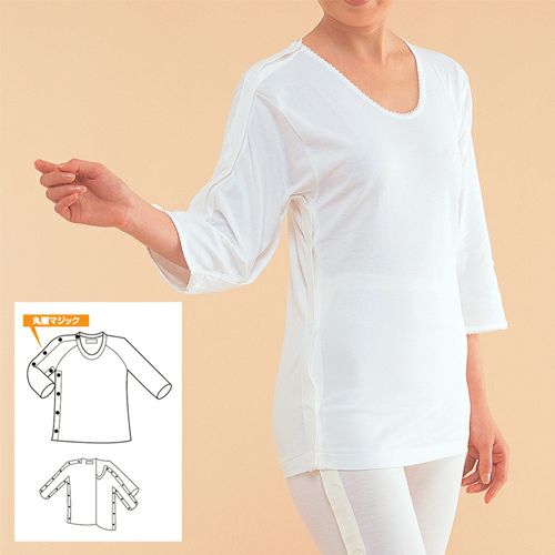 丸型マジック付きワンタッチ肌着。腕、肩の骨折や打身の治療中の方や診察や点滴時に便利。 ※肌ざわりの良い高級エジプト綿を使用。