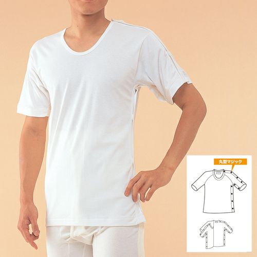 丸型マジック付きワンタッチ肌着。腕、肩の骨折や打身の治療中の方や診察や点滴時に便利。 ※肌ざわりの良い高級エジプト綿を使用。