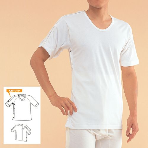 快適な日常生活をお過ごしいただけるためにお役立ていただける商品です丸型マジック付きワンタッチ肌着。腕、肩の骨折や打身の治療中の方や診察や点滴時に便利。 ※肌ざわりの良い高級エジプト綿を使用。 ◎ワンタッチ肌着◎ボタンをかける手間を全面解消した,丸型マジック式ボタン肌着。[肌へのやさしさ] 品質の基本は素材にこだわること。高級エジプト綿60単糸を使った 両面編立生地の使用によって、吸汗性、保湿性、肌ざわりのよさを 実現させました。[着心地のよさ] いつまでも快適な着心地が長続き。その理由は前立や脇開きに採用した 共生地使いや、抜群の伸縮性を生む、独自の縫製技術にあります。 腕、肩の骨折、打身の治療中の方、 診察や点滴に便利です。 透析用肌着としても便利です。 透析患者様などの肌着としても、 腕を部分的に開ける事が出来る為、チューブを通すことができます。60番手の高級エジプト綿を使用した綿100%の肌着、着心地最高です。●素材/綿100% ●品質/60単糸両面編み(高級綿)●日本製マジックテープ商品に関するご注意洗濯時にはゴミのなどの付着の原因になりますのでテープを張り合わせてください。