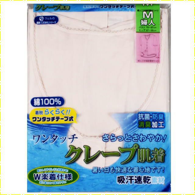 快適な日常生活をお過ごしいただけるためにお役立ていただける商品です商品の説明着替えらくらくワンタッチテープ式:楽に着られて着せやすい抗菌・防臭・消臭加工暑い日も快適な着心地です。クレープ素材とは布面に凹凸のしぼがあり、肌にすべての生地が密着しないので、通気性、吸汗性、速乾性に優れており、夏の汗をかく時期に最適の素材です。サラッとした着心地に仕上げました。吸汗速乾素材、天然素材綿100%●サイズ/S・M・L・LL●カラー/ピーチ●材質/綿100%●生産国/中国洗濯時にはゴミのなどの付着の原因になりますのでテープを張り合わせてください。