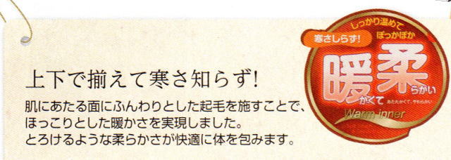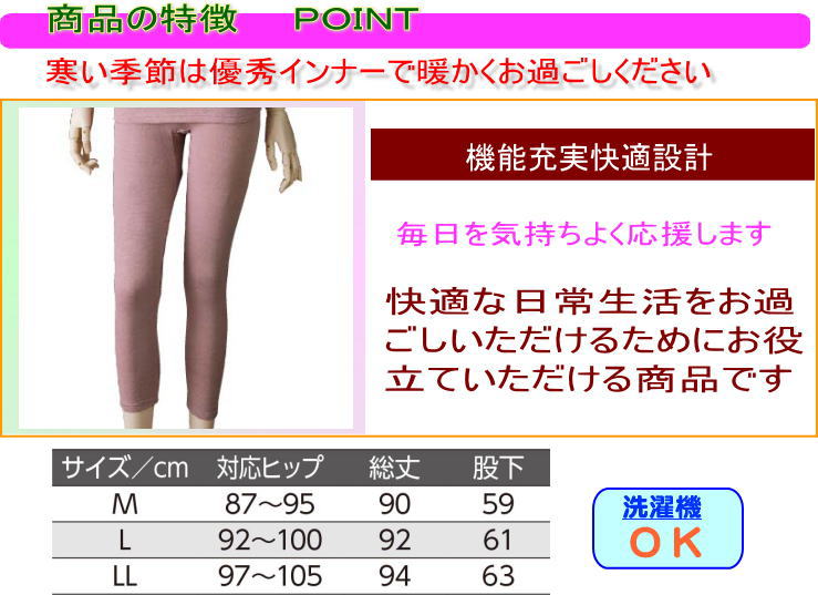 快適な日常生活をお過ごしいただけるために お役立ていただける商品です 上下で揃えて寒さ知らず!肌にあたる面にふんわりとした起毛を施すことで、ほっこりとした暖かさを実現しました。とろけるような柔らかさが快適に体を包みます。伸縮性も抜群ストレッチ性があり、体が動きやすく 心地よいフィット感で快適な着心地です。 同生地の8分袖インナーはコチラ ●品名/裏起毛スラックス下●色/チャコール・パープル・ローズ●サイズ/M・L・LL●材質/アクリル36% ナイロン27% レーヨン21% ポリエステル15% ポリウレタン1%●追加説明/●生産国/中国製●仕様/洗濯機OK のびのび 秋冬用●説明/ストレッチ(伸縮性があり程よくフィット)起毛の暖かさと抜群の伸縮性でふんわりやわらか。 厚手裏起毛インナー柔らかくて暖かい