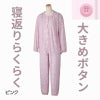 快適な日常生活をお過ごしいただけるためにお役立ていただける商品です着やすさとやさしい工夫のアイテムです心地よい肌触りのスムース素材一年中快適に着られる綿混素材。やさしいパジャマ!様々な工夫【寝返り楽々パジャマ】親切設計!通常、脇にある縫い目を前身頃に移動させました。縫い目が気にならないので寝返りがしやすく、横向きに寝た際にも、縫い目が肌に当たらず肌にやさしい!着脱カンタン!様々な工夫脱ぎ着しやすい工夫を凝らした優しい設計です。つかみやすい大きめボタンで手の力が弱くてもボタンの留め外しがラクラクです。一般のボタンに比べてつかみやすい大きめボタンを採用。この違いがご自身での着脱も簡単にしてくれます。【ななめボタンホール】ボタンホールを斜めにすることで、手指を動かしにくい方も比較的容易にボタンの留め外しができます。【手口・足口ゴム入り】手口と足口にゴム入りなので、めくれ上がりにくい設計です。後ろ身頃を長めにしているので、背中が曲がった方でも、背中が出にくい設計です。ウエスト調整ゴム付なのでゴムを入れ替えなくてもウエストサイズを自由自在に調整できます。●品名/婦人大きめボタン寝返りらくらくパジャマ 年間用●色/ピンク・パープル●サイズ/S・M・L・LL●素材/ポリエステル80%・綿20%●生産国/中国製●仕様/スムース ※柄は若干変更になる場合もございます。 洗濯機OK(ネット使用) 洗濯機OK(ネット使用) 大きめボタン&ななめボタンホール 後ろ身頃長め 年間 手口・足口ゴム入り(取替口付) ウエスト調節ゴム付●説明/心地よい肌触りのスムース素材一年中快適に着られる綿混素材。