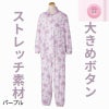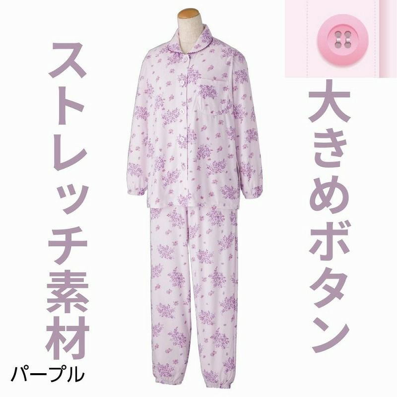 快適な日常生活をお過ごしいただけるためにお役立ていただける商品です着やすさとやさしい工夫のアイテムです伸縮自在のストレッチ素材なめらかな肌触りののびのびパジャマ。ストレッチ素材で力の弱い方でも楽にお着替えできます。生地が伸びて着脱しやすい着脱カンタン!様々な工夫脱ぎ着しやすい工夫を凝らした優しい設計です。つかみやすい大きめボタンで手の力が弱くてもボタンの留め外しがラクラクです。一般のボタンに比べてつかみやすい大きめボタンを採用。この違いがご自身での着脱も簡単にしてくれます。【ななめボタンホール】ボタンホールを斜めにすることで、手指を動かしにくい方も比較的容易にボタンの留め外しができます。【手口・足口ゴム入り】手口と足口にゴム入りなので、めくれ上がりにくい設計です。ウエスト調整ゴム付なのでゴムを入れ替えなくてもウエストサイズを自由自在に調整できます。●品名/婦人大きめボタンのびのびストレッチパジャマ 年間用●色/ピンク・パープル●サイズ/S・M・L・LL●素材/ポリエステル95%・ポリウレタン5%●生産国/中国製●仕様/ストレッチ素材 ※柄は若干変更になる場合もございます。 洗濯機OK(ネット使用) 洗濯機OK(ネット使用) 大きめボタン&ななめボタンホール のびのび 年間 手口・足口ゴム入り ウエスト調節ゴム付●説明/伸縮自在のストレッチ素材なめらかな肌触りののびのびパジャマ。ストレッチ素材で力の弱い方でも楽にお着替えできます。生地が伸びて着脱しやすい