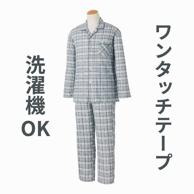 快適な日常生活をお過ごしいただけるためにお役立ていただける商品です着やすさとやさしい工夫のアイテムです【ワンタッチテープ】ボタンが留めにくい方は前合わせのワンタッチテープ仕様で、着替えがスムーズに着替えや検温時にはさっと開閉できます。 飾りボタン付で見た目は普通の洋服と変わりません肌ざわりがなめらかでやわらかなスムース素材サイズもM~4Lまで展開。着脱カンタン!様々な工夫【ワンタッチテープ】ボタンが留めにくい方は前合わせのワンタッチテープ仕様で、着替えがスムーズにワンタッチ肌着で前が開くので着脱が楽です開け閉めがさっとできるから着替えがラクラク!着やすく脱ぎやすい親切設計!前開きなので一人でも簡単につけることができますマジックテープ商品に関するご注意洗濯時にはゴミのなどの付着の原因になりますのでテープを張り合わせてください。●品名/紳士ワンタッチパジャマ 通年用●色/ブルー・グレー●サイズ/M・L・LL●素材/ポリエステル80%・綿20%●生産国/中国製●仕様/洗濯機OK ワンタッチテープ M~4Lまで展開 前開き スムース ※柄は若干変更になる場合もございます。●説明/【ワンタッチテープ】ボタンが留めにくい方は前合わせのワンタッチテープ仕様で、着替えがスムーズに着替えや検温時にはさっと開閉できます。 飾りボタン付で見た目は普通の洋服と変わりません肌ざわりがなめらかでやわらかなスムース素材サイズもM~4Lまで展開。