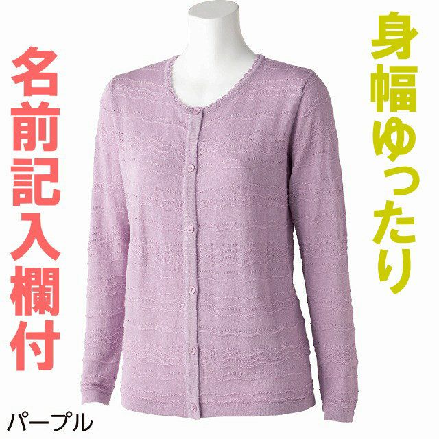 快適な日常生活をお過ごしいただけるためにお役立ていただける商品です【快適ニット】機能性とお洒落を追求しました着やすさとやさしい工夫の快適ニットですTシャツやブラウスとの相性もいいニットべストです。飽きのこないシンプルな柄のカーディガン前身頃が透かし柄で、おしゃれを演出名前記入欄付で間違い防止名前が書けるタグ付きなので、入院や施設入居時など、脱いだ後や洗濯後も他人のものと間違うことがありません。●品名/クルーネック透かし柄カーディガン●色/ベージュ・ピンク・ターコイズ・パープル・オフ●サイズ/M~L●材質/レーヨン90%・ナイロン10%●生産国/中国製●仕様/手洗い 名前記入欄付 身幅ゆったり ●説明/前身頃が透かし柄で、おしゃれを演出。
