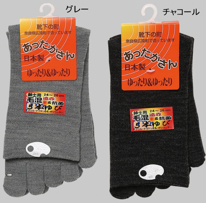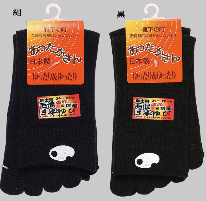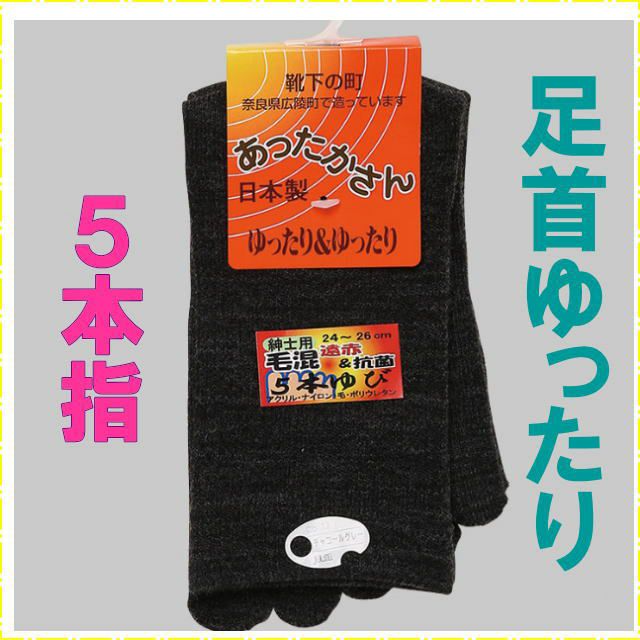 快適な日常生活をお過ごしいただけるためにお役立ていただける商品です指がムレにくい5本指タイプ5本指ソックスは指に力が入りやすく、動きもらくらく5本指ソックスは指先の通気性と吸汗性が優れ快適な履き心地ですゆったり口ゴム、遠赤抗菌加工であったか●品名/紳士毛混5本指ソックス(ゆったり口ゴム)●色/黒、紺、グレー、チャコール●サイズ/24-26㎝●材質/アクリル、ナイロン、毛、ポリウレタン●生産国/日本製●仕様・説明/しめつけないゆったり口ゴム、遠赤抗菌加工●説明/指がムレにくい5本指タイプ5本指ソックスは指に力が入りやすく、動きもらくらく5本指ソックスは指先の通気性と吸汗性が優れ快適な履き心地です