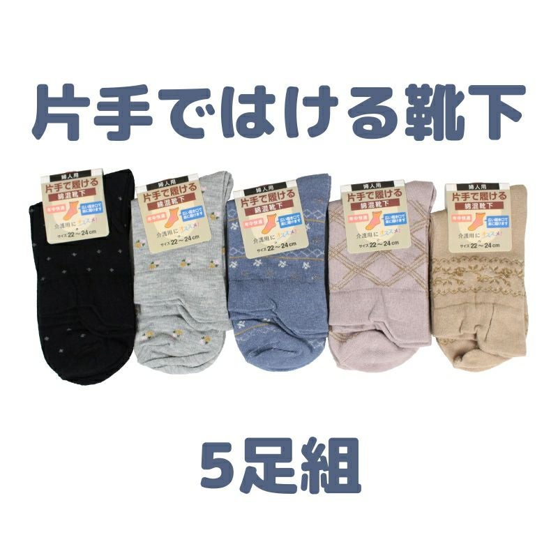 快適な日常生活をお過ごしいただけるためにお役立ていただける商品です履きやすさとやさしい工夫のアイテムです写真のような色が5足入ります。色の指定は出来ませんので、ご了承ください。●品名/片手ではける靴下5足組●色/色柄お任せ●サイズ/22-24㎝●素材/綿、ポリエステル、その他●生産国/中国製●仕様/とってもお得な5足組です●説明/写真のような色が5足入ります。色の指定は出来ませんので、ご了承ください。
