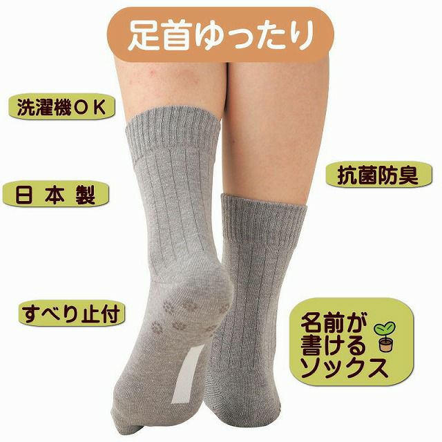 名前の書けるソックス 施設や病院で便利です。名前の書けるソックス 足下すべり止めつきで名前の書ける足首ゆったりソックスです。 足首ゆったり スベリ止め付 名前書きスペース 日本製 ◆ 足首ゆったりですべり止め付き ◆足首ゆったりで、足裏にすべり止め付きです。すり足歩行でつま先がつまずきやすい方用に、かかと部分のみすべり止め加工付きになっています。綿アクリル素材で年中使えるのも嬉しいポイント。抗菌防臭素材を使用しています。 ●品名/足首ゆったり名前の書けるスベリ止め付ソックス●色/ピンク・ベージュ・グレー●サイズ/22~24cm●材質/綿 アクリル ポリエステル ポリウレタン●追加説明/22~24cm●生産国/日本製●仕様/スベリ止め付き 足首ゆったり 洗濯機OK 抗菌防臭 ●説明/足首ゆったり・名前書きスペース足首ゆったりで、足裏にすべり止め付きです。