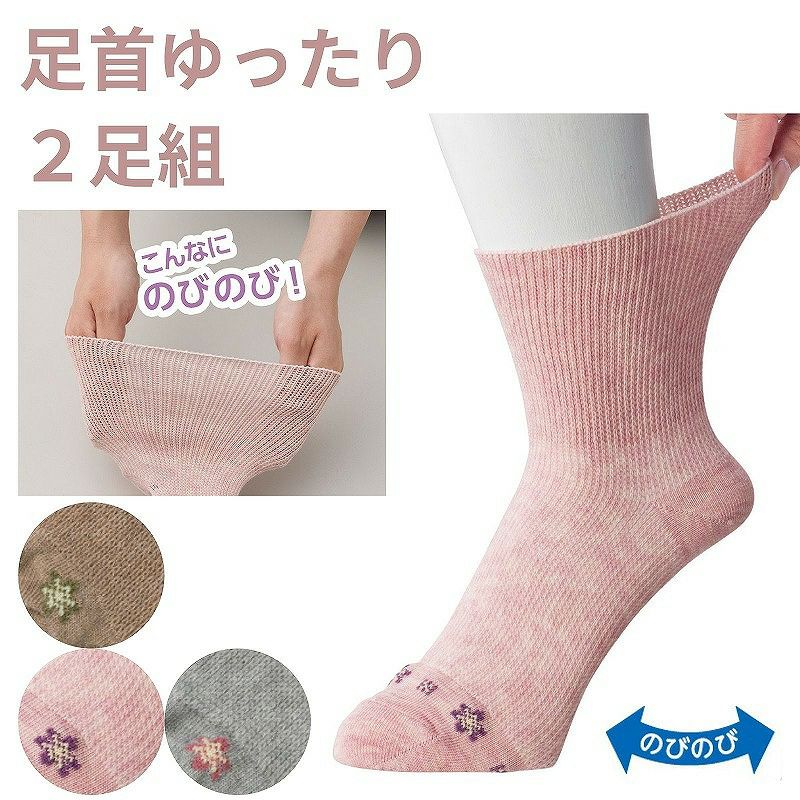 快適な日常生活をお過ごしいただけるためにお役立ていただける商品です着やすさとやさしい工夫のアイテムですゆったり伸びてらくらく履ける足首ゆったりの伸びるんですシリーズ●品名/婦人のびのびソックス(2足組)●色/ピンク・ブラウン・グレー●サイズ/22~24cm●素材/ポリエステル・綿・その他●生産国/中国製●仕様/洗濯機OK(ネット使用) のびのび 足首ゆったり 足首まわりふんわりゆったり30cm・同色2足組●説明/ゆったり伸びてらくらく履ける足首ゆったりの伸びるんですシリーズ