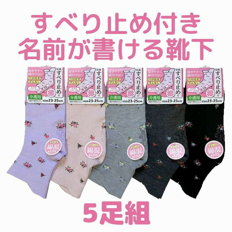 快適な日常生活をお過ごしいただけるためにお役立ていただける商品ですやさしい工夫のアイテムです足元安心のすべり止め付き。ゴムなしタイプの締め付け解消!足底に名前を書けるデザイン。●品名/婦人名前の書ける花柄ソックス 5足組●色/色柄おまかせ●サイズ/23-25cm●素材/ポリエステル・綿・ポリウレタン●生産国/中国製●仕様/爽やか綿混素材で心地よくて快適な肌触り!●説明/足元安心のすべり止め付き。ゴムなしタイプの締め付け解消!足底に名前を書けるデザイン。