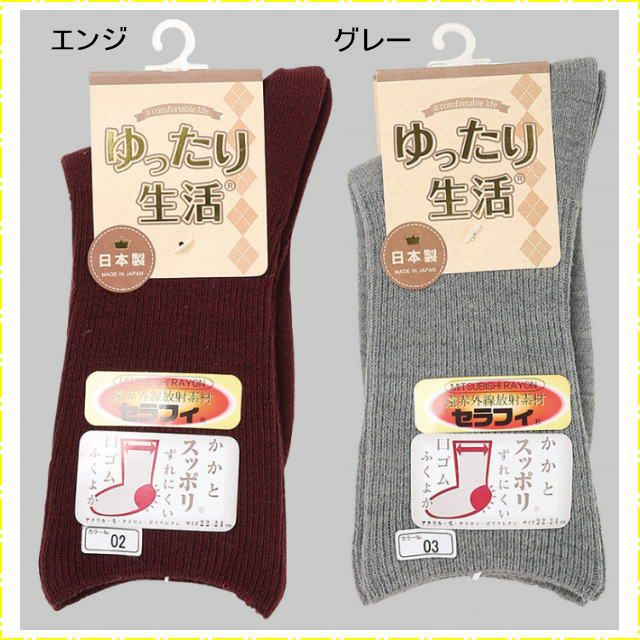 快適な日常生活をお過ごしいただけるためにお役立ていただける商品ですゆったり生活かかとすっぽりでずれにくい口ゴムふくよかで履きやすい履きやすい足首ゆったりタイプのらくらくソックスです。遠赤外線対応繊維セラフィ使用安心の日本製●品名/婦人毛混かかとすっぽりソックス(ゆったり生活)●色/エンジ、グレー、ローズ、パープル、モカ、ベージュ、アズキ、黒●サイズ/22-24㎝●材質/アクリル、毛、ナイロン、ポリウレタン●生産国/日本製●仕様・説明/防寒ソックス・ベーシック●説明/ゆったり生活かかとすっぽりでずれにくい口ゴムふくよかで履きやすい履きやすい足首ゆったりタイプのらくらくソックスです。遠赤外線対応繊維セラフィ使用安心の日本製
