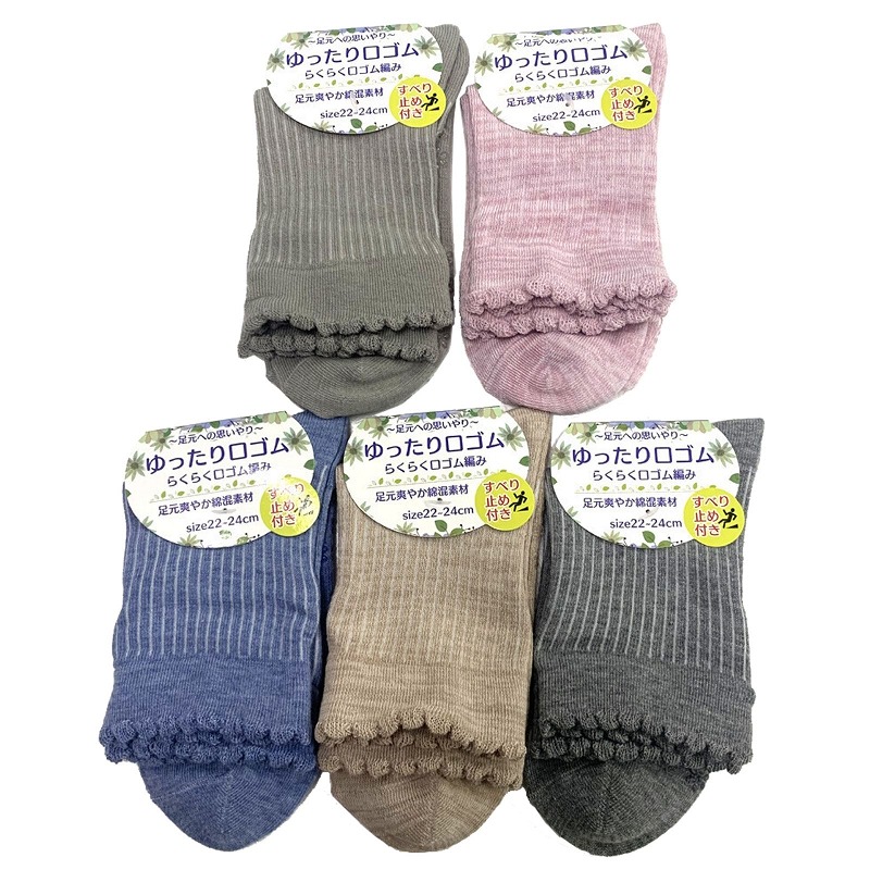 快適な日常生活をお過ごしいただけるためにお役立ていただける商品ですやさしい工夫のアイテムです滑りにくくなっておりますので、フローリングでも安全・安心♪ゆったり口ゴム仕様で締め付けず快適♪写真のような色が5足入ります。ベーシックな無地なので、どなたにでもお気軽に履いていただけます。●品名/婦人綿混リブ調無地すべり止めソックス 5足組●色/色柄お任せ●サイズ/22-24㎝●素材/ポリエステル、綿、ポリウレタン●生産国/中国製●仕様/とってもお得な5足組です●説明/口ゴムゆったり仕様で締め付けず快適です。滑りにくくなっておりますので、フローリングでも安全・安心です。写真のような色が5足入ります。ベーシックな無地なので、どなたにでもお気軽に履いていただけます。