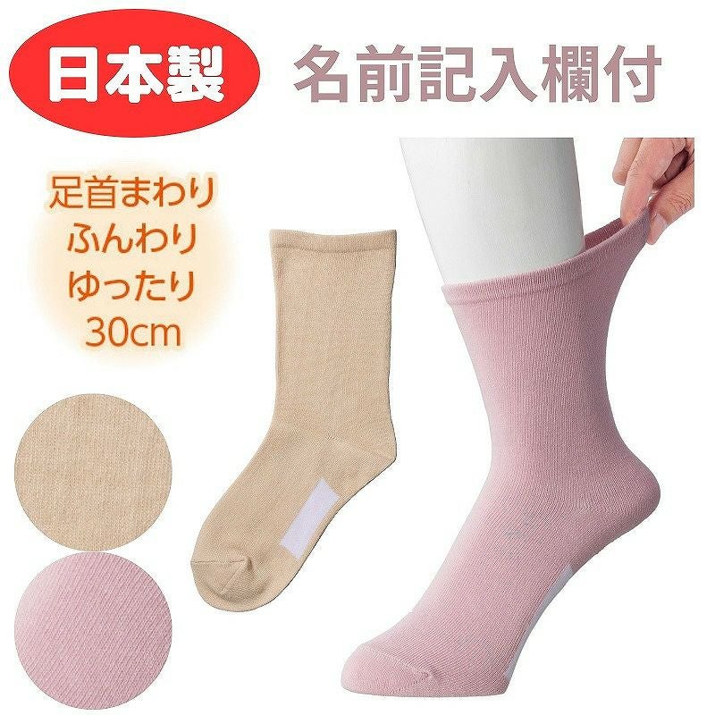 快適な日常生活をお過ごしいただけるためにお役立ていただける商品ですやさしい工夫のアイテムです名前記入欄付きで、足裏にすべり止め付きです。すり足歩行でつま先がつまずきやすい方用に、すべり止め加工付きになっていますはきやすい足首ゆったりタイプ便利な名前の書けるソックスです●品名/婦人足首ゆったり名前の書けるスベリ止め付ソックス●色/ピンク・ベージュ●サイズ/22~24cm●素材/綿・アクリル・その他●生産国/日本製●仕様/洗濯機OK 名前書きスペース すべり止め付 足首まわりゆったり30cm●説明/名前記入欄付きで、足裏にすべり止め付きです。すり足歩行でつま先がつまずきやすい方用に、すべり止め加工付きになっていますはきやすい足首ゆったりタイプ