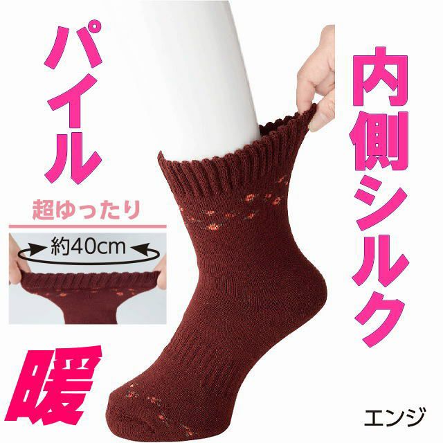 快適な日常生活をお過ごしいただけるためにお役立ていただける商品ですシルクの二重編みで冷え対策に足首は超ゆったりで締めつけ感がありません。●品名/【内側シルク二重編みあったかパイルソックス】秋冬用●色/ベージュ・グレー・エンジ・チャコール●サイズ/22~24cm●材質/アクリル・シルク・ナイロン・毛・ポリウレタン●生産国/日本製●仕様・説明/超ゆったり40cm 洗濯機OK 内側シルク使用 秋冬用 足首ゆったり さらにあったか●説明/シルクの二重編みで冷え対策に。