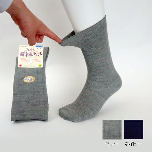 快適な日常生活をお過ごしいただけるためにお役立ていただける商品です大人気ロングセラー商品。ゴムが入っていない超ゆったりタイプ靴下です。あまり歩かれない方、足のむくみやすい方にも適しています。 足のむくみやすい方にも適しています。足の円周で、約22から34センチに対応します。ゆるゆるです。あまり歩かれない方にお勧めします。歩いているうちに、ずれ下がっても良いので とにかくゆったりした靴下が欲しいという方に適します。●サイズ/24~26cm●素材/アクリル、ナイロン、毛●生産国/日本●ゴムなしゆったり成型くつ下丈の長さ(カカトから足首までの置き寸)=約 26cm