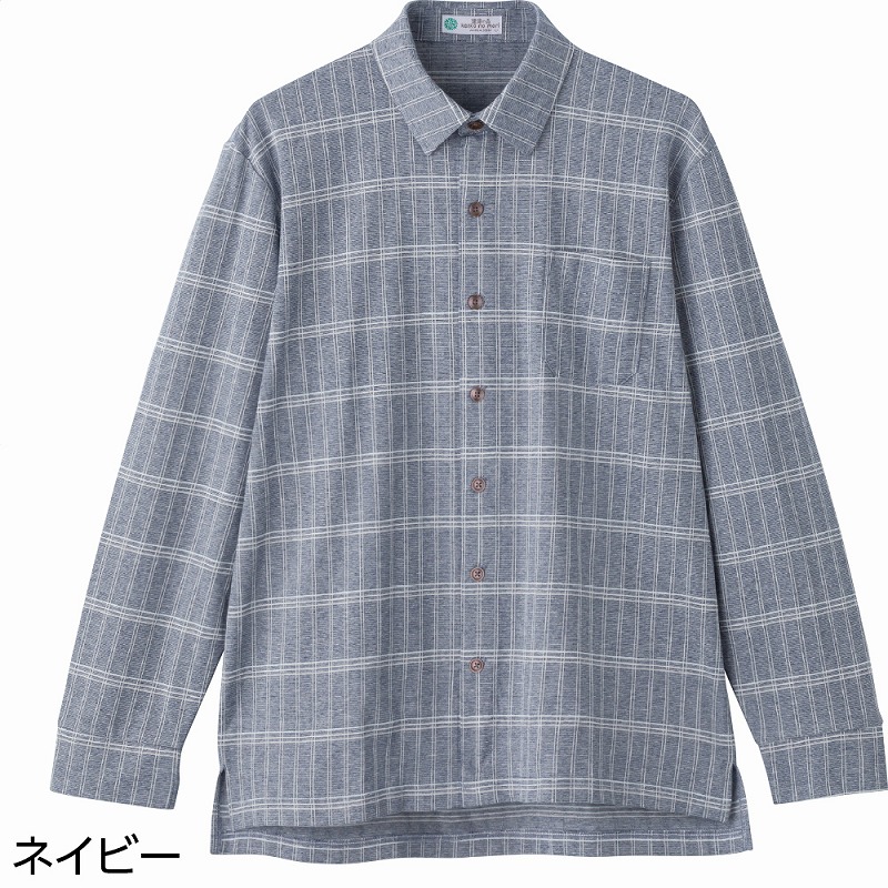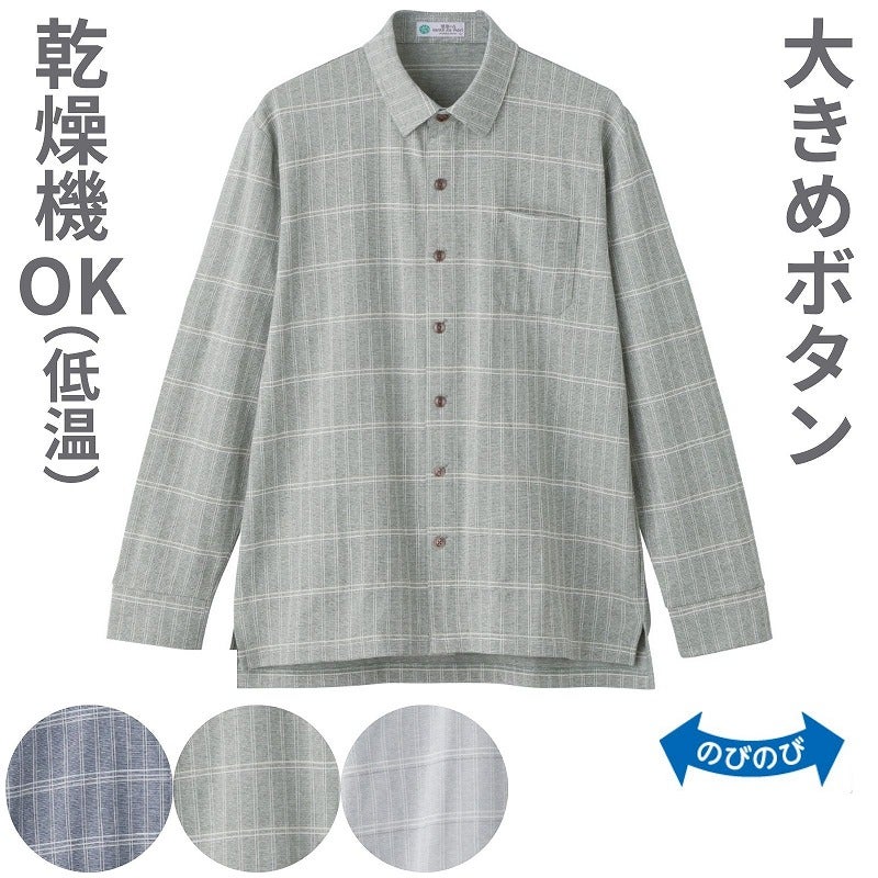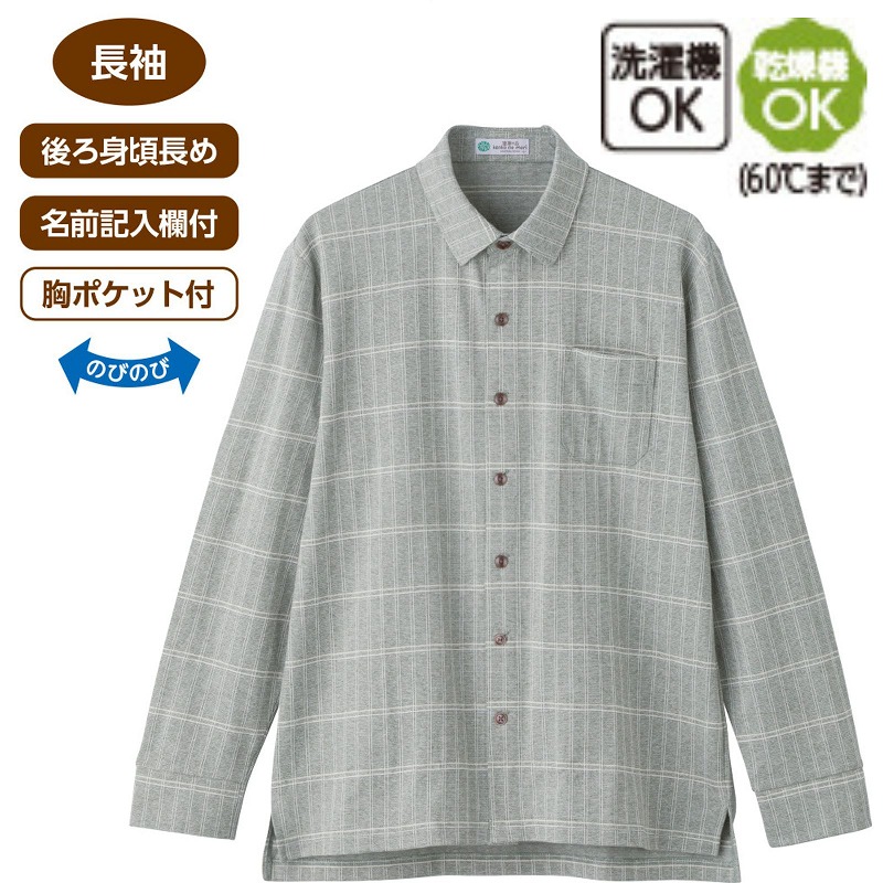 肌にやさしい綿混素材で心地よく着られるニットシャツ。大きめボタンと斜めボタンホールで留め外しがスムーズです。後ろ身頃長めで安心、胸ポケット付き、名前記入欄付き♪洗濯機・乾燥機OK(60℃まで)で扱いやすい一枚です。