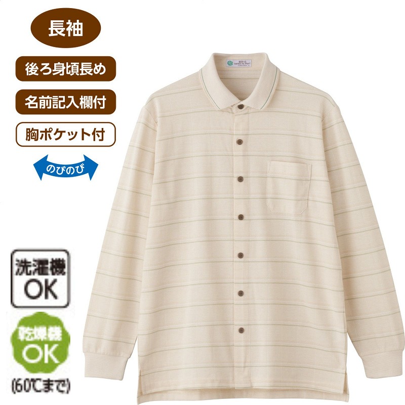 ●仕様/洗濯機OK(ネット使用) 名前記入欄付 ワンタッチテープ 胸ポケット付 後ろ身頃長め 前開きタイプ のびのび 乾燥機OK(60℃まで) 長袖
