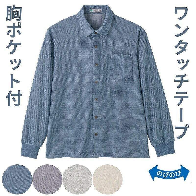 快適な日常生活をお過ごしいただけるためにお役立ていただける商品です着やすさとやさしい工夫のアイテムです動きやすくて着心地の良いニットシャツです前開きなので着替えがラクラク!カジュアルなお洒落を楽しめる定番アイテムのニットシャツです。やわらかな風合いの綿混素材。着脱カンタン!様々な工夫ワンタッチテープ仕様でボタンが留めにくい方も脱ぎ着しやすい工夫を凝らした優しい設計です。手や指の負担も軽減します。着替えや検温時にはさっと開閉できます。飾りボタンで見た目は普通の洋服と変わりませんマジックテープ商品に関するご注意洗濯時にはゴミのなどの付着の原因になりますのでテープを張り合わせてください。名前記入欄付で間違い防止名前が書けるタグ付きなので、入院や施設入居時など、脱いだ後や洗濯後も他人のものと間違うことがありません。●品名/綿混ワンタッチテープニットシャツ●色/グレー・ブルー・ネイビー・ベージュ●サイズ/M・L●素材/綿55%・ポリエステル45%●生産国/中国製●仕様/洗濯機OK(ネット使用) 名前記入欄付 ワンタッチテープ 胸ポケット付 のびのび 長袖 ●説明/動きやすくて着心地の良いニットシャツです前開きなので着替えがラクラク!カジュアルなお洒落を楽しめる定番アイテムのニットシャツです。やわらかな風合いの綿混素材。