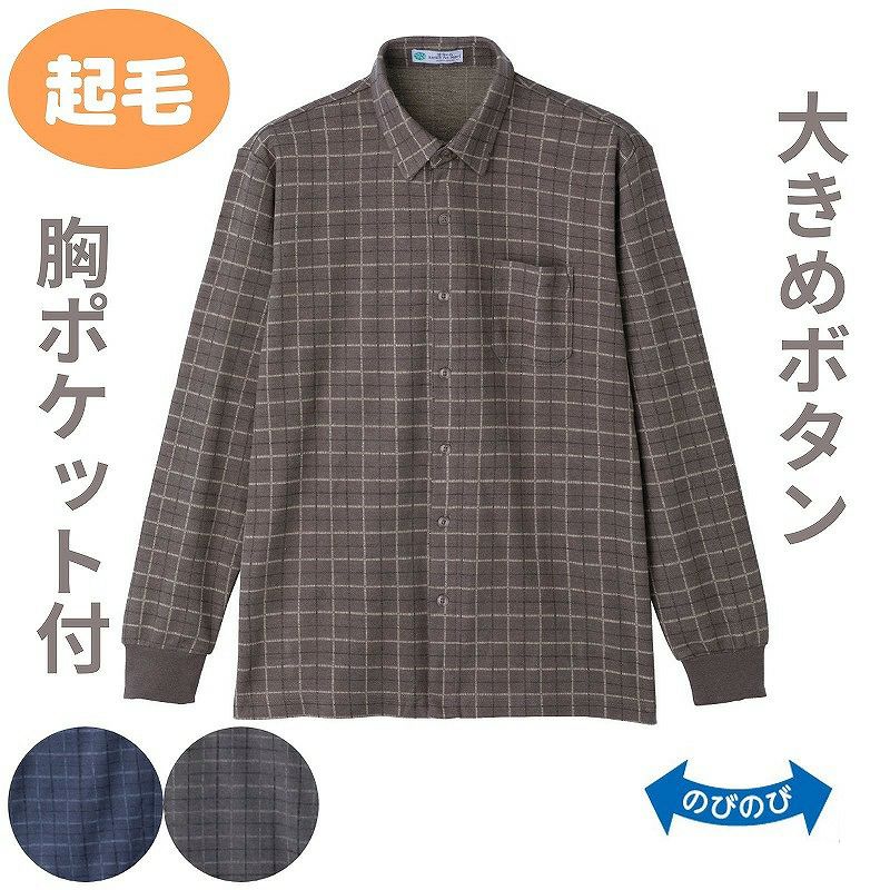 快適な日常生活をお過ごしいただけるためにお役立ていただける商品です着やすさとやさしい工夫のアイテムです【あなたにやさしいお洋服】ちょっとした困りごとを機能で解決!やさしい機能がいっぱいの一枚でおしゃれが決まるニットシャツです指先の力が弱くなった人や片手が動かない人に便利です表生地を起毛させた、暖かな着心地。着脱カンタン!様々な工夫つかみやすい大きめボタンと斜めに開いたボタンホールにより片手でもボタンの留め外しが負担なくできます。脱ぎ着しやすい工夫を凝らした優しい設計です。名前記入欄付で間違い防止名前が書けるタグ付きなので、入院や施設入居時など、脱いだ後や洗濯後も他人のものと間違うことがありません。●品名/紳士起毛斜め釦ホールニットシャツ●色/グレー・ネイビー・ブラウン●サイズ/M・L●素材/ポリエステル65%・レーヨン35%●生産国/中国製●仕様/洗濯機OK のびのび 名前記入欄付 大きめボタン&斜めボタンホール 胸ポケット付 起毛●説明/【あなたにやさしいお洋服】ちょっとした困りごとを機能で解決!やさしい機能がいっぱいの一枚でおしゃれが決まるニットシャツです指先の力が弱くなった人や片手が動かない人に便利です表生地を起毛させた、暖かな着心地。