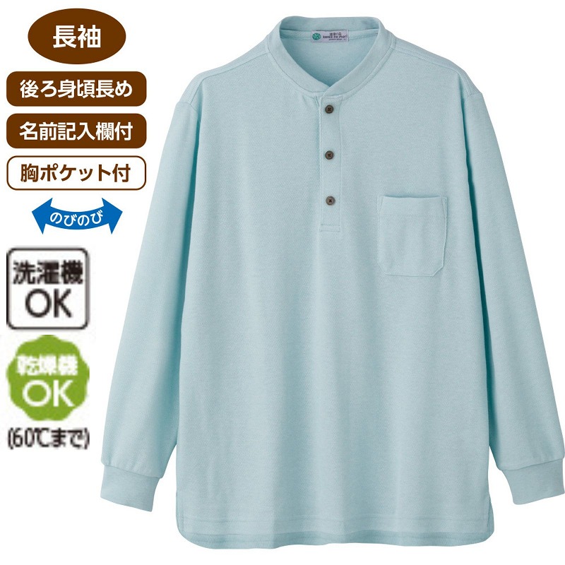 肌ざわりの良い綿混素材を使用したヘンリーネックTシャツ。スナップボタンでパチンと簡単に留まり、着脱がスムーズです♪後ろ身頃長めで安心の着心地。胸ポケット付き、名前記入欄付きで施設利用にも便利。洗濯機・乾燥機(60℃まで)OKです。