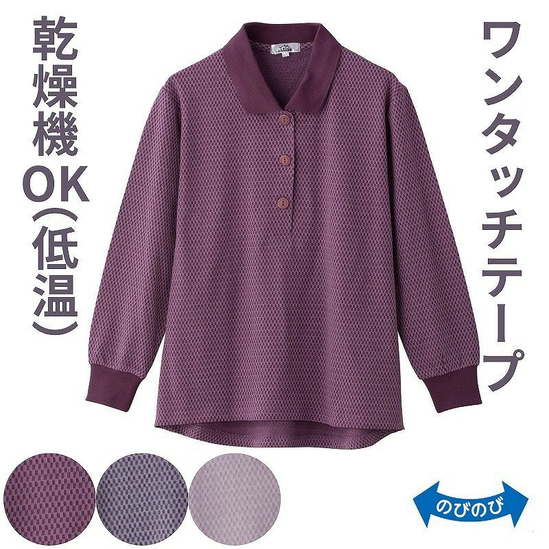 快適な日常生活をお過ごしいただけるためにお役立ていただける商品です着やすさとやさしい工夫のアイテムですシーンを選ばず便利!1枚は欲しいポロシャツです脱ぎ着しやすい長めの20㎝半開で着脱スムーズ!秋から長く使える素材です。乾燥機が使えるからお手入れ簡単!【乾燥機対応アウター】お手入れラクラクでうれしい!お洗濯の手間が減ります。乾燥機は低温でご使用ください。後ろ身頃を長めにしているので、背中が曲がった方でも、背中が出にくい設計です。ゆったりした身幅で、脱ぎ着もしやすく、快適な着心地です。名前記入欄付で間違い防止名前が書けるタグ付きなので、入院や施設入居時など、脱いだ後や洗濯後も他人のものと間違うことがありません。●品名/ワンタッチテープポロシャツ●色/ピンクベージュ・ワイン・パープル●サイズ/M~L・LL●素材/綿60%・ポリエステル40%、衿部分:ポリエステル100%、袖リブ部分:ポリエステル95%・ポリウレタン5%●生産国/中国製●仕様/洗濯機OK(ネット使用) 名前記入欄付 ワンタッチテープ 後ろ身頃長め 身幅ゆったり のびのび 乾燥機OK(60℃まで) 長めの20㎝半開●説明/シーンを選ばず便利!1枚は欲しいポロシャツです脱ぎ着しやすい長めの20㎝半開で着脱スムーズ!秋から長く使える素材です。乾燥機が使えるからお手入れ簡単!【乾燥機対応アウター】お手入れラクラクでうれしい!お洗濯の手間が減ります。乾燥機は低温でご使用ください。