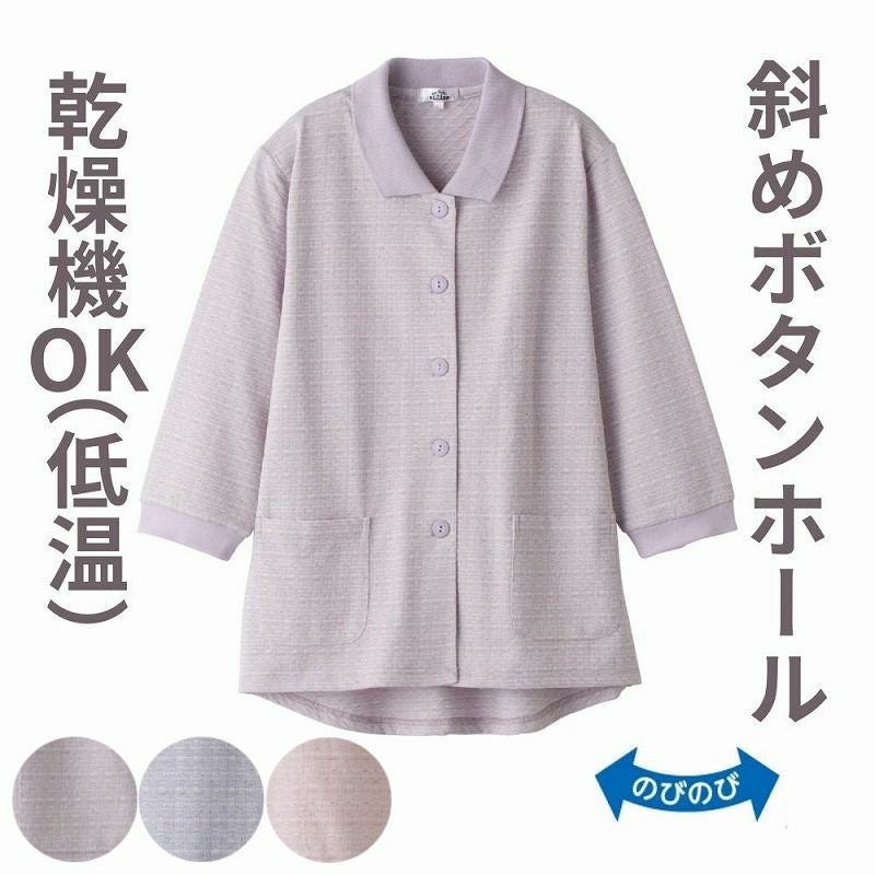 快適な日常生活をお過ごしいただけるためにお役立ていただける商品です着やすさとやさしい工夫のアイテムです【あなたにやさしいお洋服】機能性とお洒落を追求しました着やすさとやさしい工夫がうれしい!自分で着れる人も着せる人も笑顔になれる前向きなお洋服です爽やかなうっすらボーダー柄ジャカード。着脱カンタン!様々な工夫力が入りやすくつかみやすい大きめボタンと斜めボタンホールで留め外しがスムースで脱ぎ着しやすい工夫を凝らした優しい設計です。ゆったりした身幅で、脱ぎ着もしやすく、快適な着心地です。名前記入欄付で間違い防止名前が書けるタグ付きなので、入院や施設入居時など、脱いだ後や洗濯後も他人のものと間違うことがありません。後ろ身頃を長めにしているので、背中が曲がった方でも、背中が出にくい設計です。●品名/婦人7分袖斜め釦ホールポロカーディ●色/ローズ・パープル・ブルーパープル●サイズ/M~L・LL・3L●素材/綿50%・ポリエステル50%、衿部分:ポリエステル100%、袖部分:ポリエステル95%・ポリウレタン5%●生産国/中国製●仕様/洗濯機OK 名前記入欄付 大きめボタン&斜めボタンホール 後ろ身頃長め 前ポケット付 身幅ゆったり のびのび 7分袖 乾燥機OK(低温) 3Lサイズあり●説明/【あなたにやさしいお洋服】機能性とお洒落を追求しました着やすさとやさしい工夫がうれしい!自分で着れる人も着せる人も笑顔になれる前向きなお洋服です爽やかなうっすらボーダー柄ジャカード。