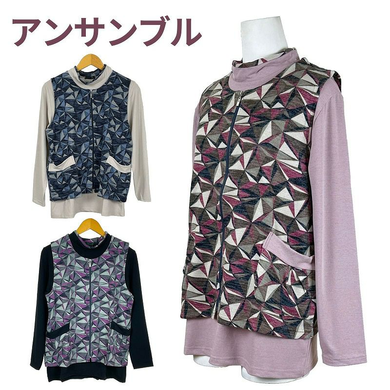 ●説明/伸縮性のある長袖インナーと、前ファスナー仕様のベストがセットになった婦人ジップベストアンサンブルです。