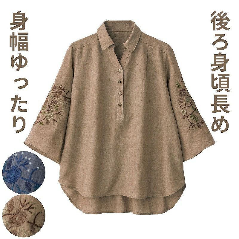 快適な日常生活をお過ごしいただけるためにお役立ていただける商品です着やすさとやさしい工夫のアイテムです【カジュアルスタイル】お出かけにも普段着にも着られるから多方面で大活躍のアイテム身幅ゆったりで、着心地がいいからうれしいネ!夏の定番インド綿で軽やかに!すっぽりかぶれて便利な半開タイプ。袖の刺繍がシックで素敵。ゆったりした身幅で、脱ぎ着もしやすく、快適な着心地です。後ろ身頃を長めにしているので、背中が曲がった方でも、背中が出にくい設計です。●品名/7分袖クラフト刺繍半開ブラウス●色/モカ・ネイビー●サイズ/M・L・LL●素材/ポリエステル70%・綿30%●生産国/インド製●仕様/手洗い 身幅ゆったり 後ろ身頃長め 7分袖 ●説明/【カジュアルスタイル】お出かけにも普段着にも着られるから多方面で大活躍のアイテム身幅ゆったりで、着心地がいいからうれしいネ!夏の定番インド綿で軽やかに!すっぽりかぶれて便利な半開タイプ。袖の刺繍がシックで素敵。