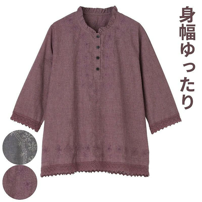 快適な日常生活をお過ごしいただけるためにお役立ていただける商品です着やすさとやさしい工夫のアイテムです【カジュアルスタイル】お出かけにも普段着にも着られるから多方面で大活躍のアイテム身幅ゆったりで、着心地がいいからうれしいネ!夏の定番インド綿で軽やかに!シンプルながらたっぷり感のある刺繍が素敵!ゆったりした身幅で、脱ぎ着もしやすく、快適な着心地です。●品名/7分袖刺繍半開ブラウス●色/ローズ・グレー●サイズ/M・L・LL●素材/ポリエステル65%・綿35%●生産国/インド製●仕様/手洗い 身幅ゆったり 7分袖 ●説明/【カジュアルスタイル】お出かけにも普段着にも着られるから多方面で大活躍のアイテム身幅ゆったりで、着心地がいいからうれしいネ!夏の定番インド綿で軽やかに!シンプルながらたっぷり感のある刺繍が素敵!
