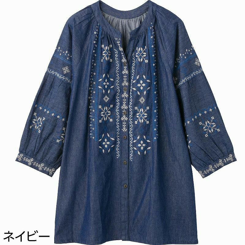 【婦人7分袖デニム刺繍前開きTブラウス ネイビーLLのみ】 wzA18-821246z