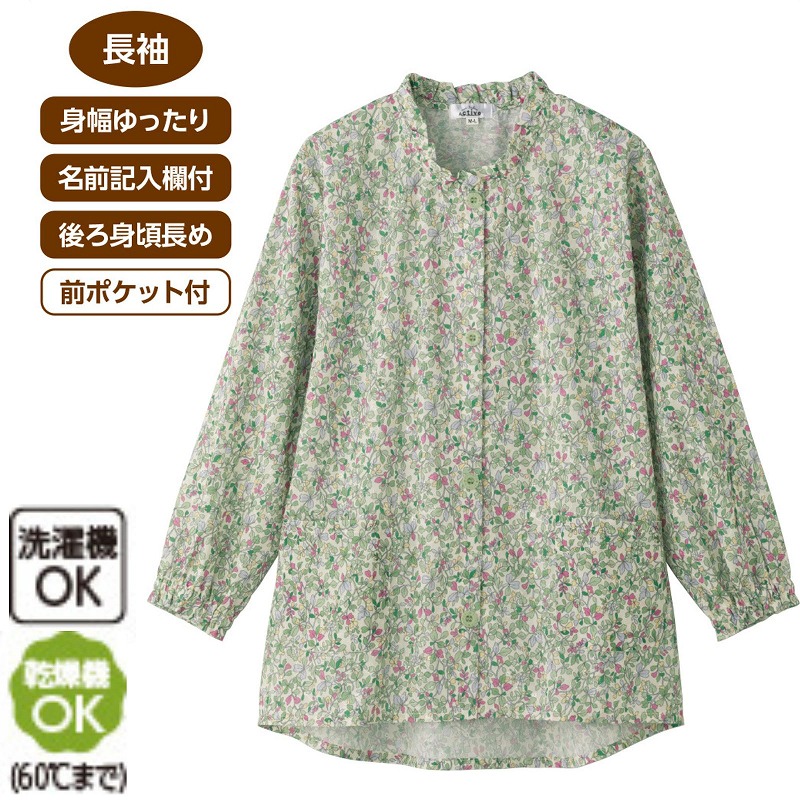 ●仕様/袖口ゴム入りで着脱スムーズ 洗濯機OK 名前記入欄付 スナップボタン 前ポケット付 後ろ身頃長め 身幅ゆったり 乾燥機OK(60℃まで) 長袖