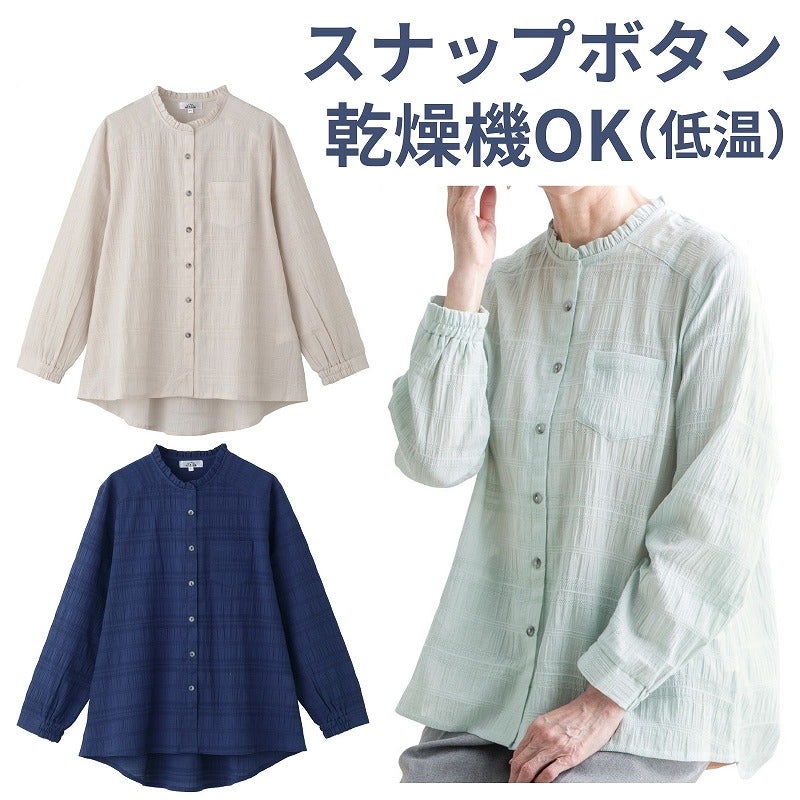 春夏にぴったりの、さわやかな素材感が心地よいスナップ釦ブラウス。シンプルで上品なカラーは大人の装いにも合わせやすく、毎日のコーデに活躍します。見た目は普通のボタン仕様ですが、裏はスナップボタンで開け閉め簡単。袖口ゴム入りで腕まくりや着脱もスムーズにでき、着心地と使いやすさを両立した一枚です。