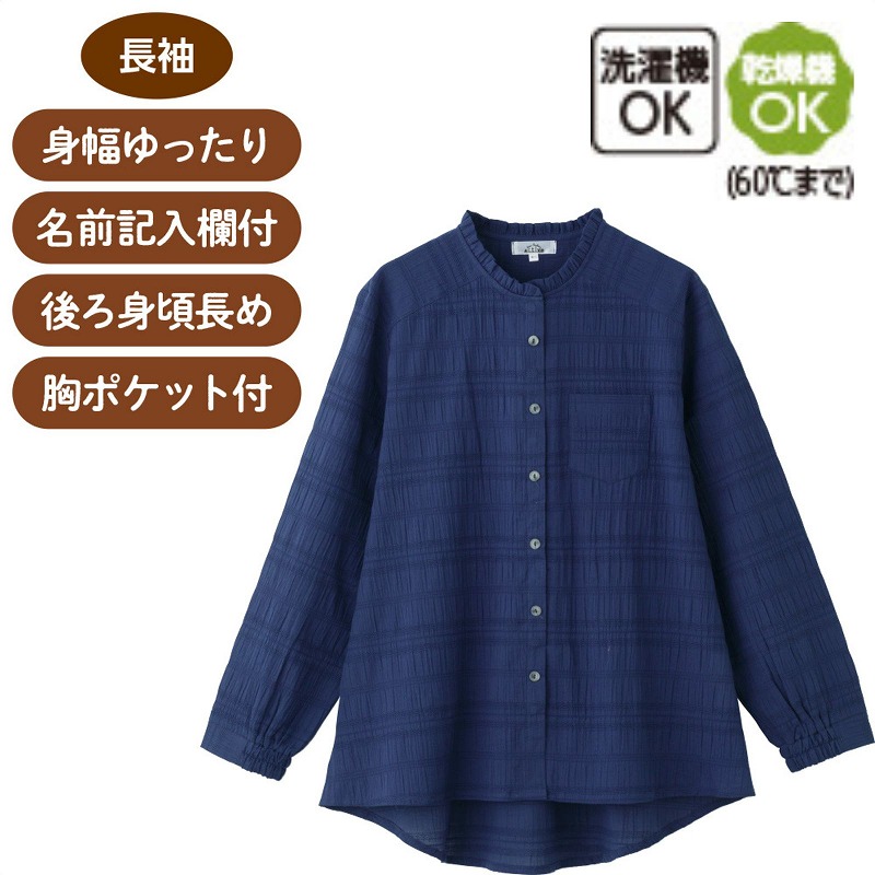 ●仕様/洗濯機OK(ネット使用) 袖口ゴム入りで着脱スムーズ 名前記入欄付 スナップボタン 胸ポケット付 後ろ身頃長め 身幅ゆったり 乾燥機OK(60℃まで) 長袖
