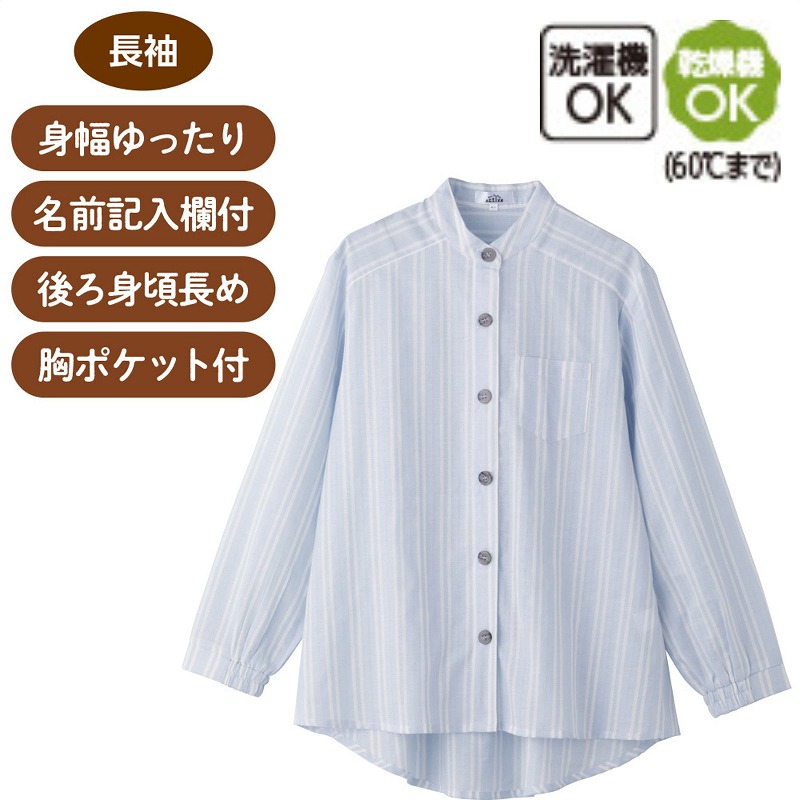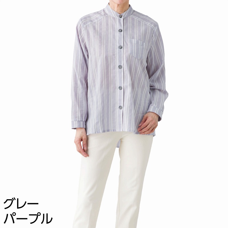 快適な日常生活をお過ごしいただけるためにお役立ていただける商品です着やすさとやさしい工夫のアイテムです綿100%のやさしい肌ざわりで、毎日快適に着られる長袖ブラウスです。すっきり見えるストライプ柄で上品な印象に。斜め釦ホール仕様でボタンの開け閉めがしやすく、着脱もスムーズに行えます。袖口はゴム入りで腕まくりもしやすく、身幅ゆったり・後ろ身頃長めで体型カバーにも◎。胸ポケット付きで便利、名前記入欄付きなので施設用・デイサービス・普段使いにもおすすめです。着脱カンタン!様々な工夫力が入りやすくつかみやすい大きめボタンと斜めボタンホールで留め外しがスムースで脱ぎ着しやすい工夫を凝らした優しい設計です。後ろ身頃を長めにしているので、背中が曲がった方でも、背中が出にくい設計です。ゆったりした身幅で、脱ぎ着もしやすく、快適な着心地です。名前記入欄付で間違い防止名前が書けるタグ付きなので、入院や施設入居時など、脱いだ後や洗濯後も他人のものと間違うことがありません。●品名/斜め釦ホールブラウス●色/サックス・グレーパープル・ラベンダー●サイズ/M~L・LL●素材/綿100%●生産国/中国製●仕様/洗濯機OK(ネット使用) ※第1ボタンは斜めボタンホール仕様ではありません。 名前記入欄付 長袖 大きめボタン&斜めボタンホール 胸ポケット付 後ろ身頃長め 袖口ゴム入りで着脱スムーズ 身幅ゆったり 乾燥機OK(60℃まで)綿100%でさわやかな着心地!スッキリ見えるストライプ。