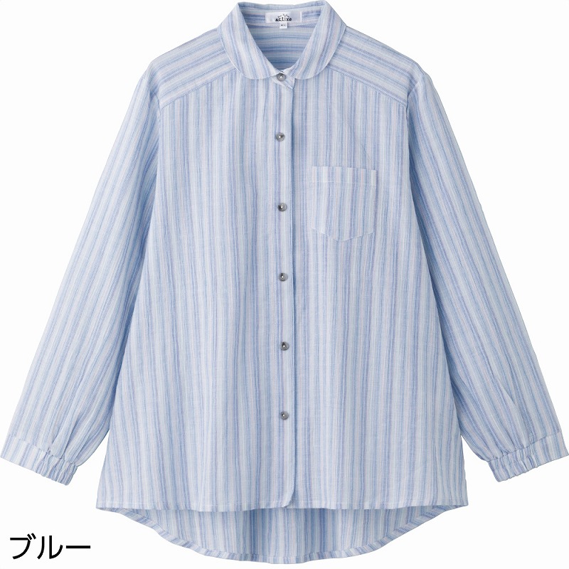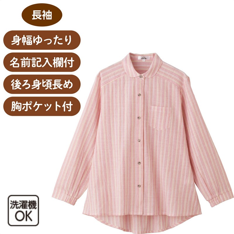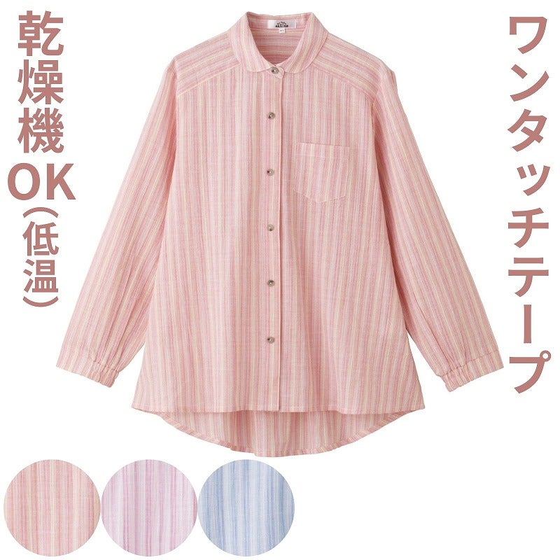 快適な日常生活をお過ごしいただけるためにお役立ていただける商品です着やすさとやさしい工夫のアイテムです明るい春夏カラーのストライプ柄が目を引く、綿素材の長袖ブラウス。見た目はボタン仕様ですが、裏側はワンタッチテープで開け閉め簡単。袖口ゴム入りで腕まくりしやすく、着脱もスムーズです。身幅ゆったり&後ろ身頃長めの安心シルエットに、胸ポケットと名前記入欄付きで実用性も◎。普段着から介護・リハビリ用途まで快適に着られる一枚です。着脱カンタン!様々な工夫ワンタッチテープ仕様でボタンが留めにくい方も脱ぎ着しやすい工夫を凝らした優しい設計です。手や指の負担も軽減します。着替えや検温時にはさっと開閉できます。飾りボタンで見た目は普通の洋服と変わりませんマジックテープ商品に関するご注意洗濯時にはゴミのなどの付着の原因になりますのでテープを張り合わせてください。後ろ身頃を長めにしているので、背中が曲がった方でも、背中が出にくい設計です。ゆったりした身幅で、脱ぎ着もしやすく、快適な着心地です。名前記入欄付で間違い防止名前が書けるタグ付きなので、入院や施設入居時など、脱いだ後や洗濯後も他人のものと間違うことがありません。●品名/ワンタッチテープブラウス●色/ローズ・オレンジ・ブルー●サイズ/M~L●素材/綿99%・ポリウレタン1%●生産国/中国製●仕様/洗濯機OK(ネット使用) ※第1ボタンはワンタッチテープ仕様ではありません。 名前記入欄付 ワンタッチテープ 胸ポケット付 後ろ身頃長め 袖口ゴム入りで着脱スムーズ 身幅ゆったり 長袖定番のストライプ柄も春夏らしい明るいカラーで素敵にアップデート!