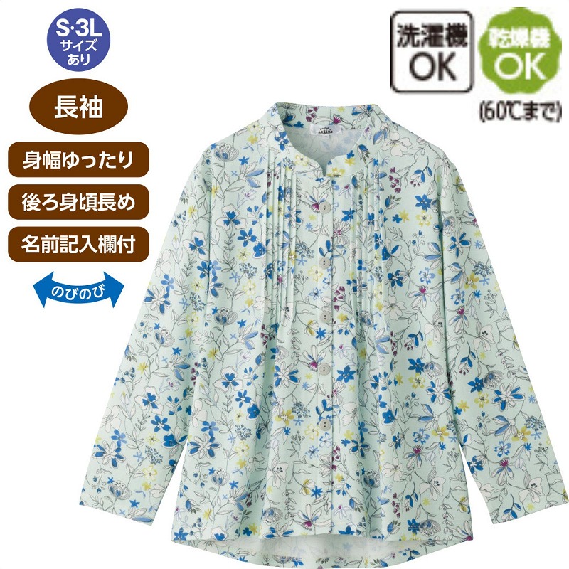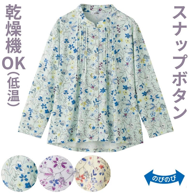 毎年人気のピンタックブラウスに、留め外ししやすいスナップボタンタイプが登場♪やさしいパステルカラーが装いを明るく見せてくれます。身幅ゆったりのラクな着心地に、後ろ身頃が少し長めで背中まわりも安心。名前記入欄つきで便利に使え、洗濯機・乾燥機(60℃まで)OKでお手入れも簡単です。