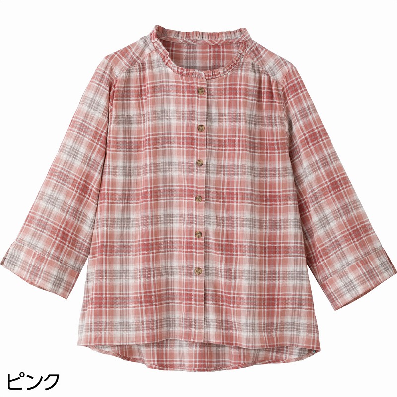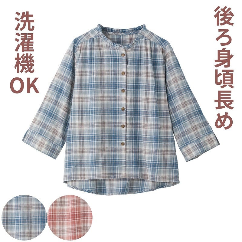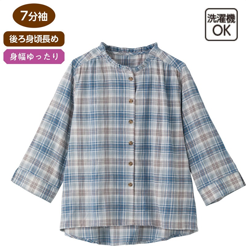 快適な日常生活をお過ごしいただけるためにお役立ていただける商品です着やすさとやさしい工夫のアイテムです定番デザインのブラウスに、さりげないフリルネックを添えて顔まわりを華やかな印象に仕上げました。やわらかな雰囲気で上品に着こなせる一枚です。七分袖で手元がもたつかず動きやすく、身幅ゆったりのシルエットと後ろ身頃長めの丈が体のラインをやさしくカバー。普段使いにもお出かけにも取り入れやすく、快適に着られます。ゆったりした身幅で、脱ぎ着もしやすく、快適な着心地です。後ろ身頃を長めにしているので、背中が曲がった方でも、背中が出にくい設計です。●品名/7分袖フリルネックブラウス●色/ピンク・ブルー●サイズ/M・L●素材/綿99%・ポリウレタン1%●生産国/中国製●仕様/洗濯機OK(ネット使用) 後ろ身頃長め 身幅ゆったり 7分袖 定番のブラウスもフリルネックで顔まわり華やかに♪