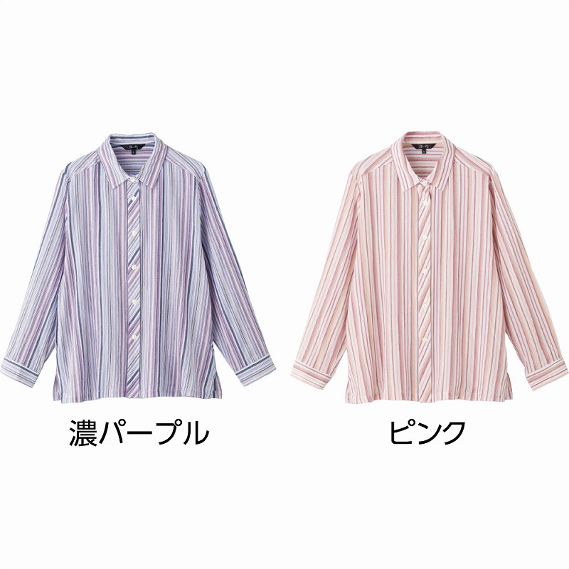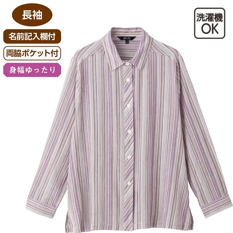 快適な日常生活をお過ごしいただけるためにお役立ていただける商品です着やすさとやさしい工夫のアイテムです綿100%の楊柳素材で、さらりとしたさわやかな着心地のブラウス。表面に凹凸のある生地が肌離れを良くし、汗ばむ季節でも快適に過ごせます。やわらかな風合いと軽やかなストライプ柄で、上品で涼しげな印象に。長袖仕様で季節の変わり目や冷房対策にも便利です。身幅ゆったりのシルエットに加え、両脇ポケット付きで実用性も◎。名前記入欄付きで施設や外出時にも安心して着用できます。ゆったりした身幅で、脱ぎ着もしやすく、快適な着心地です。名前記入欄付で間違い防止名前が書けるタグ付きなので、入院や施設入居時など、脱いだ後や洗濯後も他人のものと間違うことがありません。●品名/綿100%楊柳ブラウス●色/ピンク・ラベンダー・濃パープル●サイズ/M・L●素材/綿100%●生産国/中国製●仕様/洗濯機OK(ネット使用) 名前記入欄付 両脇ポケット付 身幅ゆったり 長袖 綿100%でさわやかな着心地!