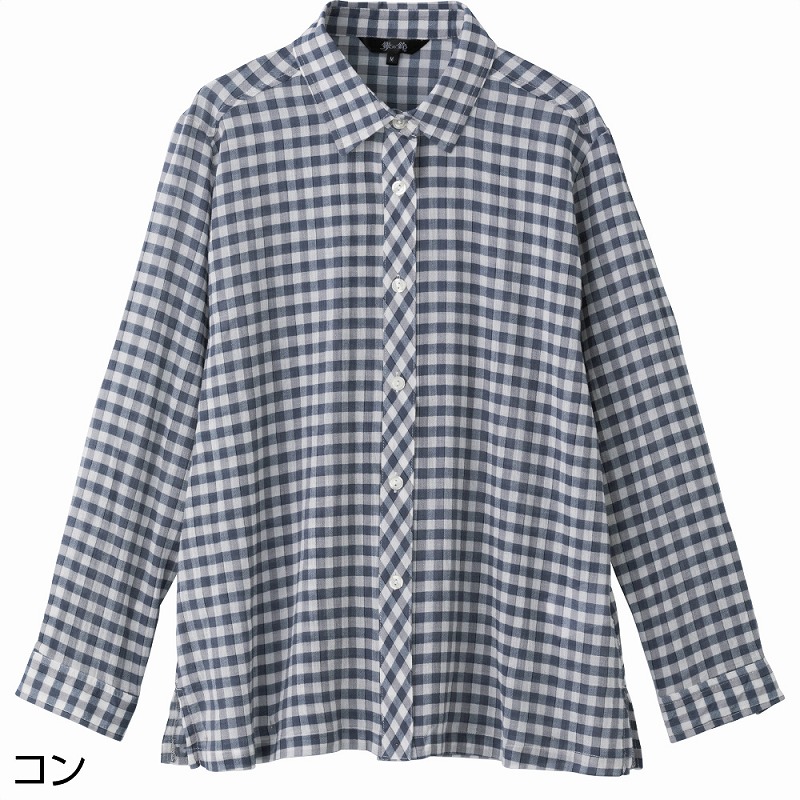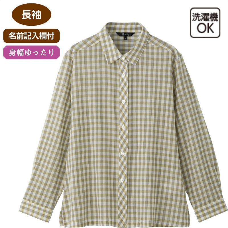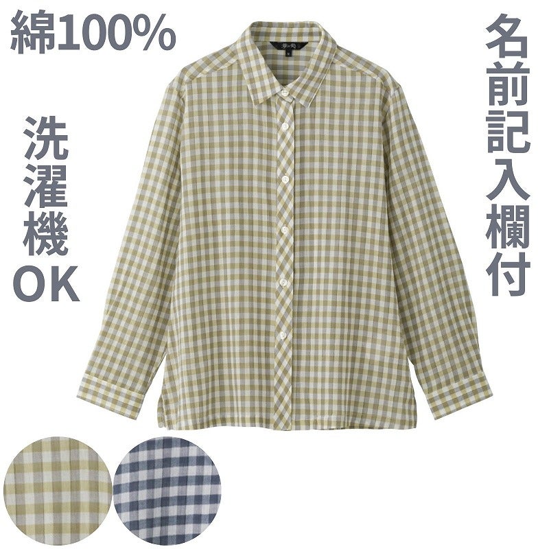 綿100%素材のやさしい肌ざわりで、さわやかに着られる格子柄ブラウス。軽やかな着心地で季節を問わず活躍し、ナチュラルな雰囲気のチェック柄が装いのアクセントになります。長袖仕様で冷房対策や季節の変わり目にも便利。身幅ゆったりのシルエットで体のラインを拾いにくく、リラックスして着られます。名前記入欄付きで施設や外出時にも安心です。