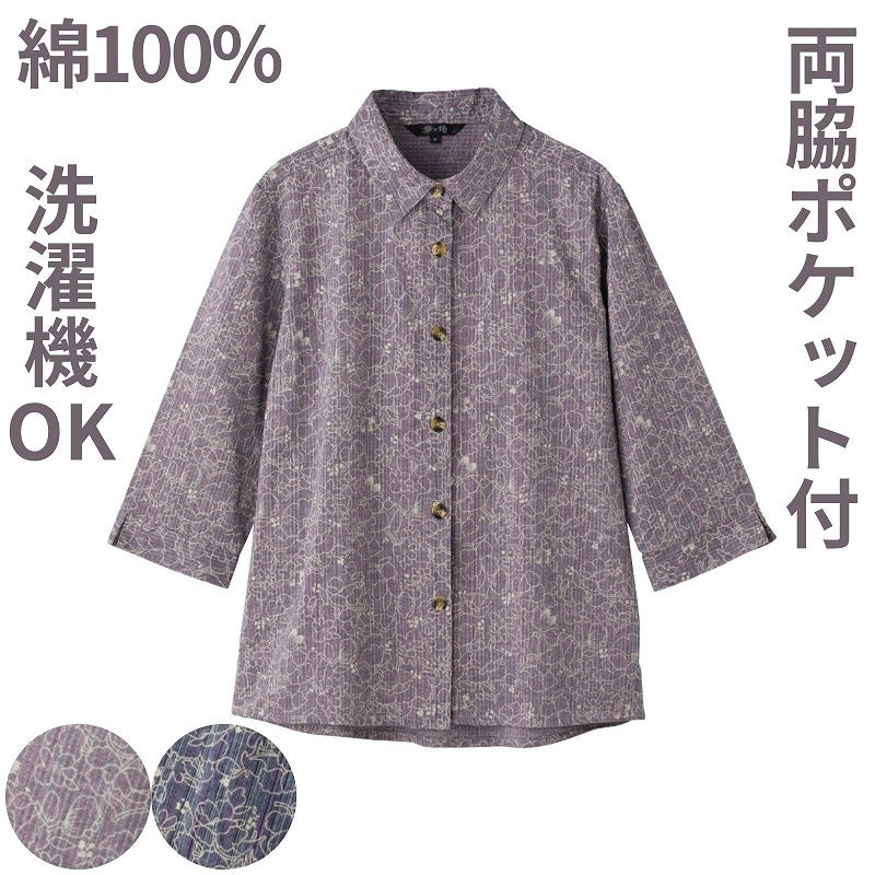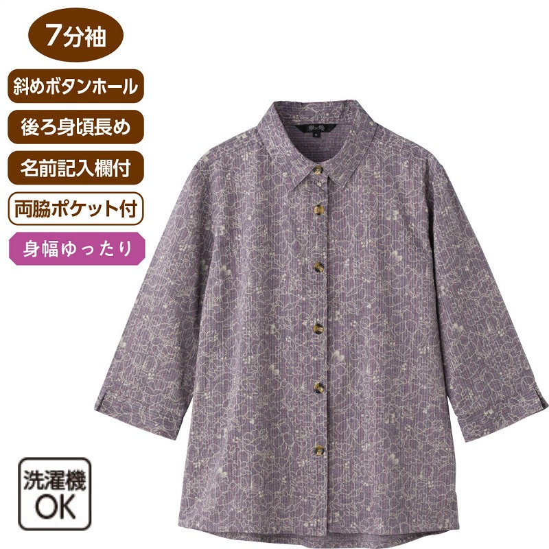 快適な日常生活をお過ごしいただけるためにお役立ていただける商品です着やすさとやさしい工夫のアイテムです両脇に便利なポケットを備え、ちょっとした小物の持ち歩きにも重宝する一枚。肌にやさしい綿100%素材を使用した七分袖ブラウスで、斜めボタンホール仕様により着脱もスムーズに行えます。身幅ゆったりの設計で締め付け感が少なく、後ろ身頃長めのデザインがお腹まわりや腰まわりを自然にカバー。名前記入欄付きで管理もしやすく、毎日の装いに安心して取り入れられます。着脱カンタン!様々な工夫力が入りやすくつかみやすい大きめボタンと斜めボタンホールで留め外しがスムースで脱ぎ着しやすい工夫を凝らした優しい設計です。後ろ身頃を長めにしているので、背中が曲がった方でも、背中が出にくい設計です。ゆったりした身幅で、脱ぎ着もしやすく、快適な着心地です。名前記入欄付で間違い防止名前が書けるタグ付きなので、入院や施設入居時など、脱いだ後や洗濯後も他人のものと間違うことがありません。●品名/7分袖綿100%斜め釦ホールブラウス●色/ローズ・パープル●サイズ/M・L●素材/綿100%●生産国/中国製●仕様/洗濯機OK(ネット使用) ※第1ボタンは斜めボタンホール仕様ではありません。 名前記入欄付 斜めボタンホール 両脇ポケット付 後ろ身頃長め 身幅ゆったり 7分袖 両脇ポケット付きで便利♪