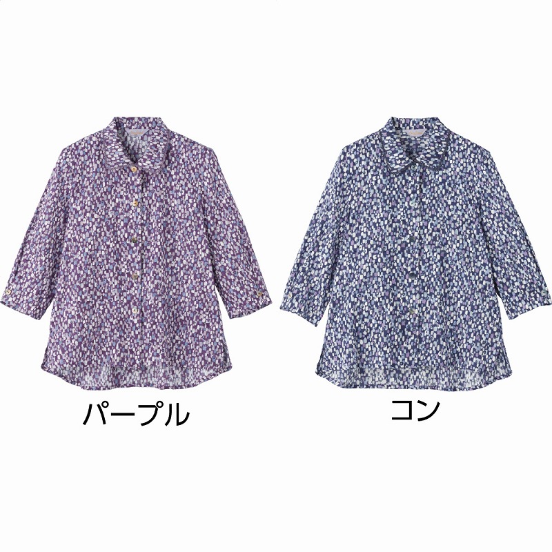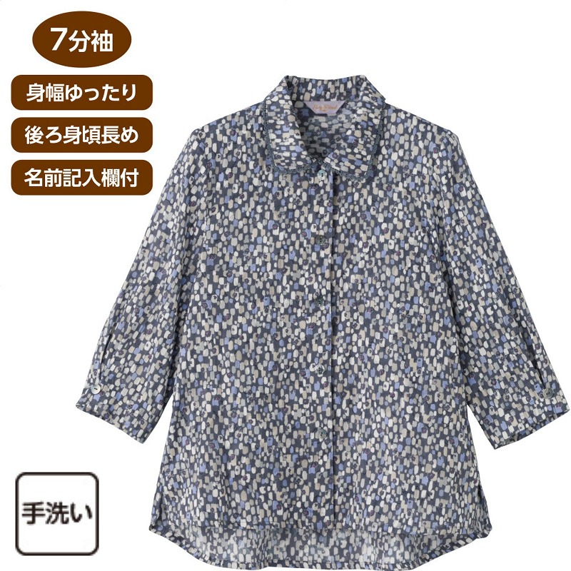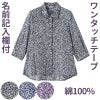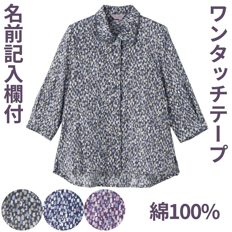 快適な日常生活をお過ごしいただけるためにお役立ていただける商品です着やすさとやさしい工夫のアイテムです涼やかな綿100%楊柳素材で、さらっと快適に着られる7分袖ブラウス。見た目は普通のボタン、裏はワンタッチ仕様で開け閉め簡単です。身幅ゆったり&後ろ身頃長めで安心の着心地、名前記入欄付きで便利♪春夏にぴったりの軽やかな一枚です。着脱カンタン!様々な工夫ワンタッチテープ仕様でボタンが留めにくい方も脱ぎ着しやすい工夫を凝らした優しい設計です。手や指の負担も軽減します。着替えや検温時にはさっと開閉できます。飾りボタンで見た目は普通の洋服と変わりませんマジックテープ商品に関するご注意洗濯時にはゴミのなどの付着の原因になりますのでテープを張り合わせてください。ゆったりした身幅で、脱ぎ着もしやすく、快適な着心地です。名前記入欄付で間違い防止名前が書けるタグ付きなので、入院や施設入居時など、脱いだ後や洗濯後も他人のものと間違うことがありません。後ろ身頃を長めにしているので、背中が曲がった方でも、背中が出にくい設計です。●品名/7分袖ワンタッチテープブラウス●色/グレー・パープル・コン●サイズ/M・L●素材/綿100%●生産国/中国製●仕様/手洗い 名前記入欄付 ワンタッチテープ 身幅ゆったり 7分袖 後ろ身頃長め 涼やかな綿100%楊柳素材。さらっとした風合いで春夏にピッタリです。