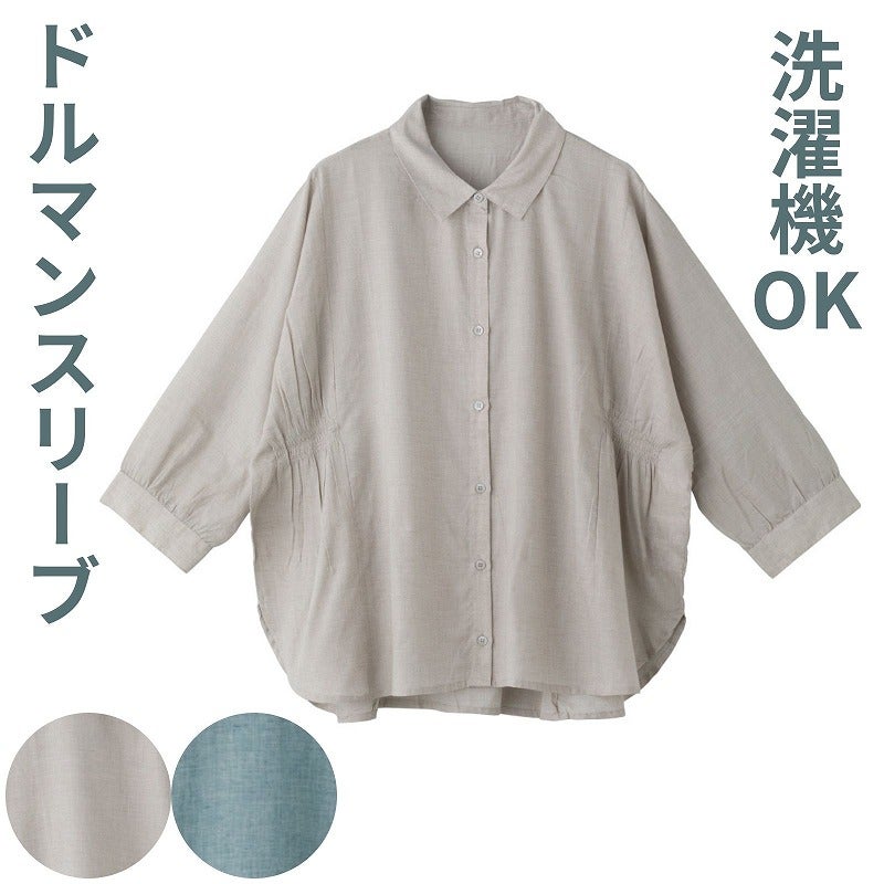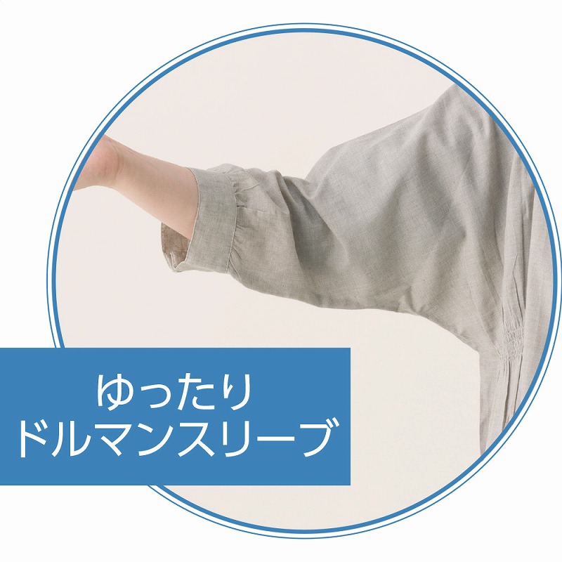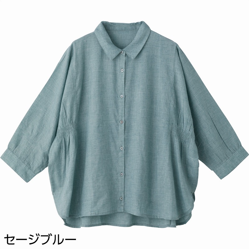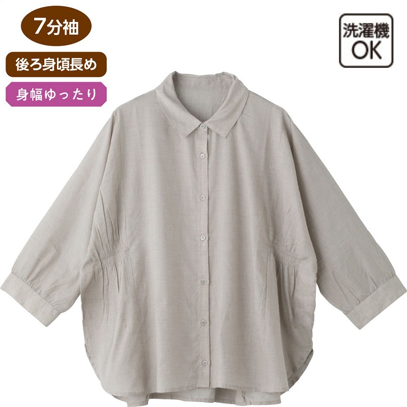 快適な日常生活をお過ごしいただけるためにお役立ていただける商品です着やすさとやさしい工夫のアイテムですゆったりとしたドルマンスリーブで腕まわりが動かしやすく、長時間着ても快適な着心地の7分袖シャンブレーブラウスです。身幅ゆったり&後ろ身頃長めのデザインで体型をやさしくカバー。軽くてやわらかな綿素材で季節の変わり目にもぴったり。普段使いはもちろん、お出かけやリラックスタイムにもおすすめの一枚です。ゆったりした身幅で、脱ぎ着もしやすく、快適な着心地です。後ろ身頃を長めにしているので、背中が曲がった方でも、背中が出にくい設計です。●品名/7分袖シャンブレーブラウス●色/グレージュ・セージブルー●サイズ/M~L●素材/ポリエステル81%・綿19%●生産国/インド製●仕様/洗濯機OK(ネット使用) ゆったりドルマンスリーブ 後ろ身頃長め 身幅ゆったり 7分袖 ゆったりしたドルマンスリーブで着心地快適。