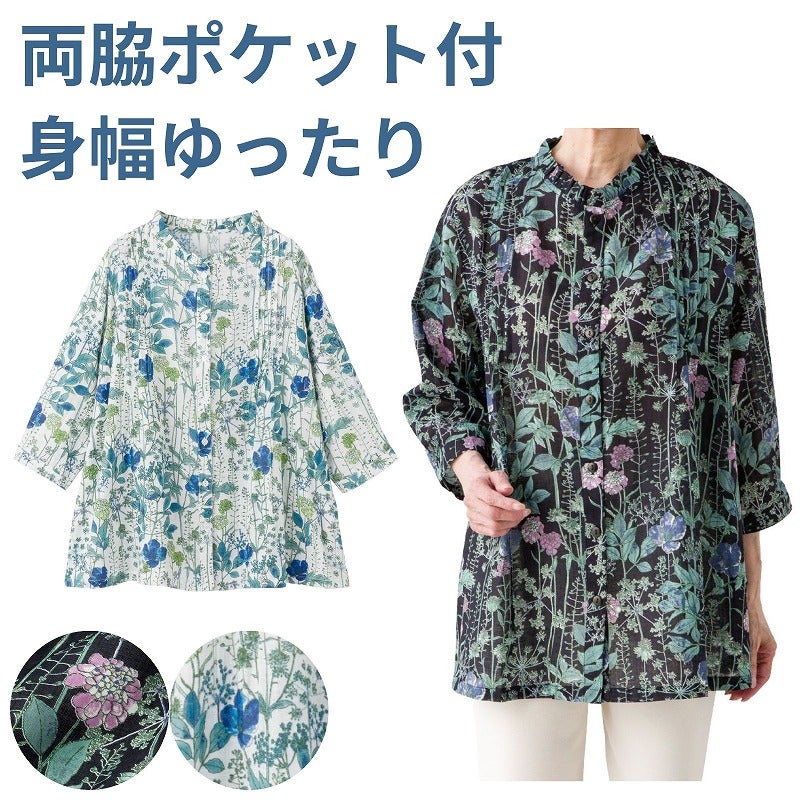 快適な日常生活をお過ごしいただけるためにお役立ていただける商品です着やすさとやさしい工夫のアイテムです肌ざわりのよい涼やかな綿麻素材で、軽やかに着られる一枚です♪ 上品な花柄が落ち着いた大人の装いにやさしくなじみます。両脇ポケット付きで便利に使え、●品名/綿麻花柄前開きブラウス●色/キナリ・ブラック●サイズ/M・L●素材/綿90%・麻10%●生産国/インド製●仕様/手洗い 両脇ポケット付 身幅ゆったり 長袖 肌触りがよく涼やかな綿麻素材。上品な花柄が大人にぴったり!
