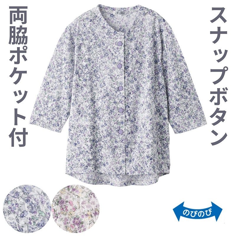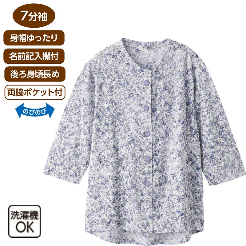 快適な日常生活をお過ごしいただけるためにお役立ていただける商品です着やすさとやさしい工夫のアイテムですスナップボタン仕様で着脱もらくらくなブラウスです♪春夏らしいやわらかな生地で、心地よく軽やかに着られます。身幅ゆったりのラクな着心地に、後ろ身頃が少し長めで背中まわりも安心。七分袖で動きやすく、両脇ポケット付きで便利。名前記入欄つきで使いやすい一枚です。着脱カンタン!様々な工夫スナップボタン仕様でボタンが留めにくい方も脱ぎ着しやすい工夫を凝らした優しい設計です。手や指の負担も軽減します。着替えや検温時にはさっと開閉できます。飾りボタンで見た目は普通の洋服と変わりません後ろ身頃を長めにしているので、背中が曲がった方でも、背中が出にくい設計です。ゆったりした身幅で、脱ぎ着もしやすく、快適な着心地です。名前記入欄付で間違い防止名前が書けるタグ付きなので、入院や施設入居時など、脱いだ後や洗濯後も他人のものと間違うことがありません。●品名/7分袖スナップ釦ブラウス●色/ローズ・ブルー●サイズ/M~L●素材/ポリエステル55%・綿45%●生産国/中国製●仕様/洗濯機OK(ネット使用) 名前記入欄付 スナップボタン 両脇ポケット付 後ろ身頃長め 身幅ゆったり のびのび 7分袖 スナップボタンで着脱らくらく♪春夏らしいやわらかな生地。